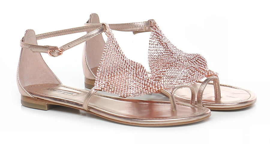 Flache Zehenstegsandale aus laminiertem Leder mit Knöchelriemen und Strasssteinen am Obermaterial, Ledersohle. Ferse 15.