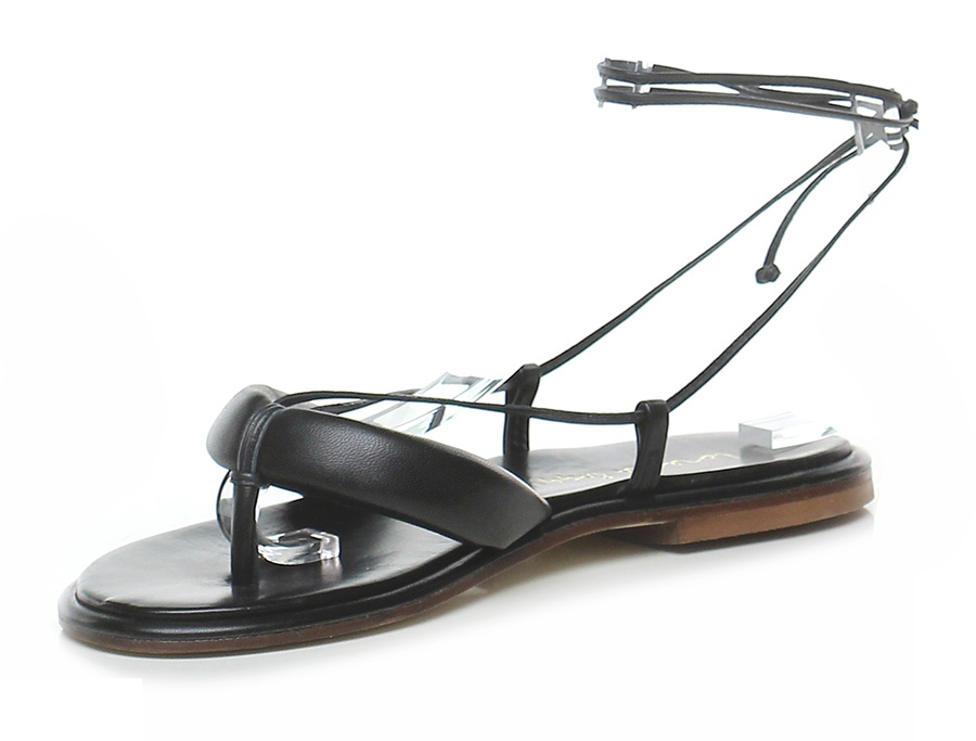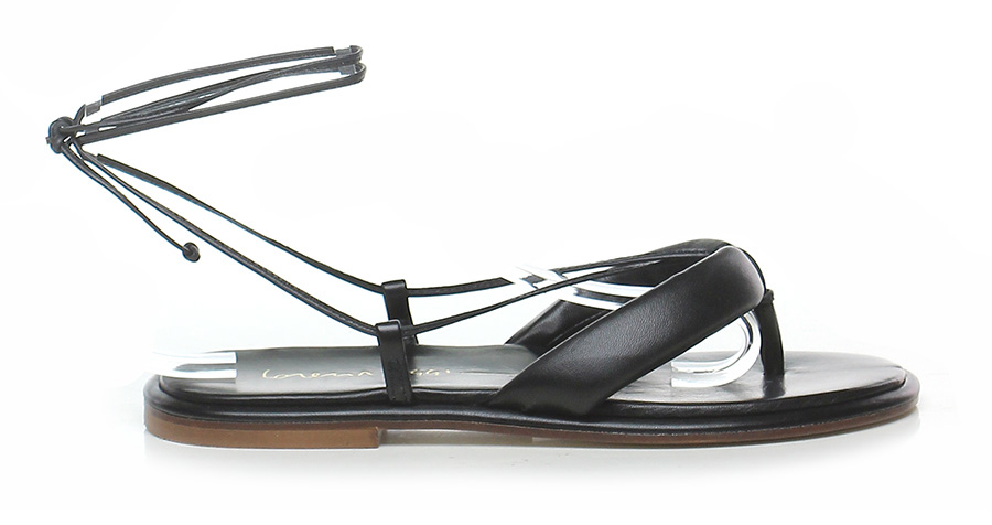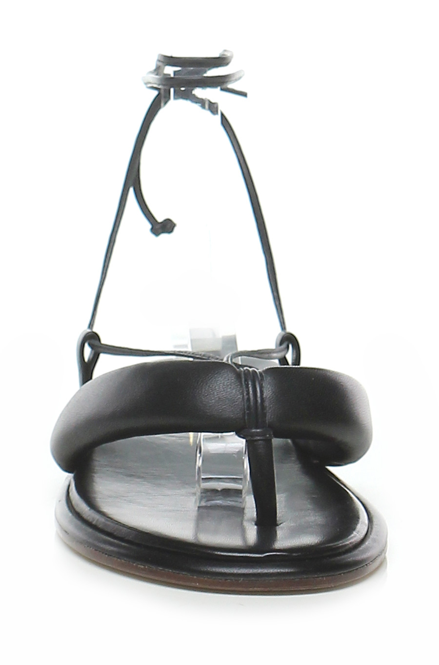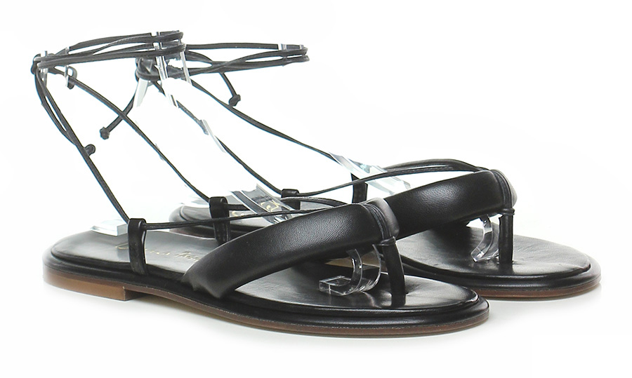 Niedrige Zehenstegsandale aus gepolstertem Leder mit Knöchelschnürung, Ledersohle. Ferse 10.