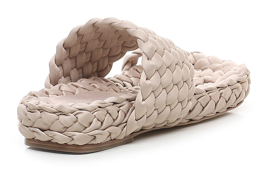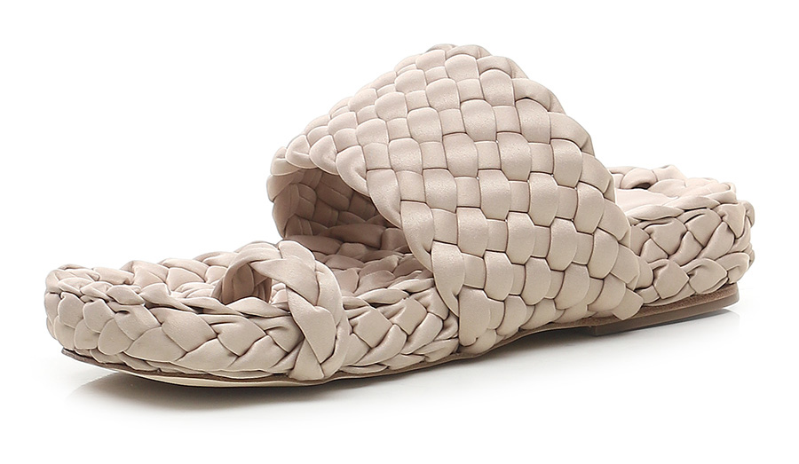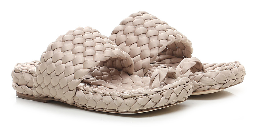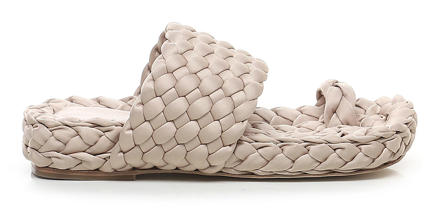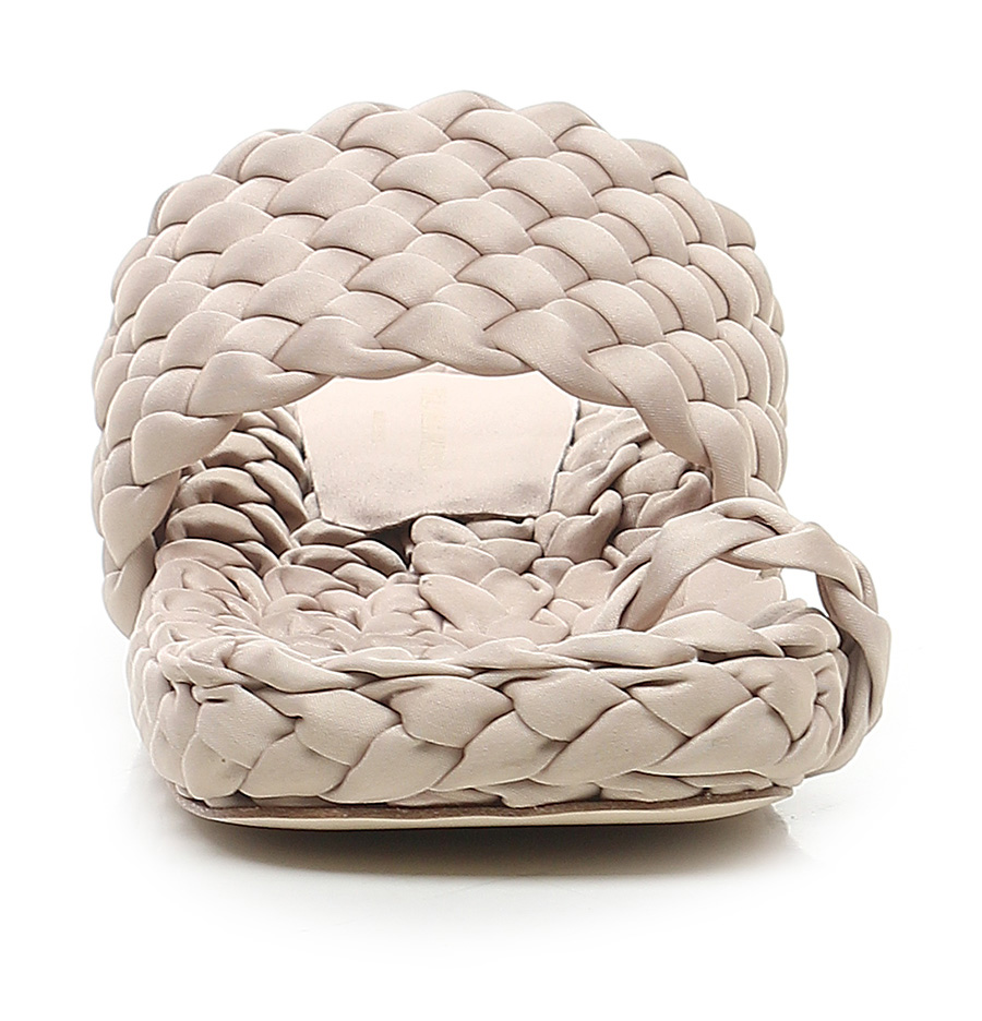 Satinsandale mit gewebtem Obermaterial und Plateau. Ledersohle. Absatzhöhe 35 mm, Plateau 25 mm mit 10 mm Absatz.