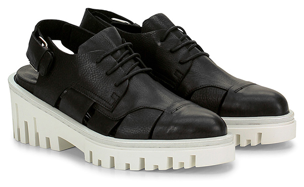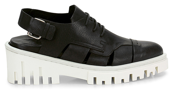 Halbschuh aus Leder mit Einsätzen am Obermaterial und Riemchen hinten. Gummisohle, 70er Absatz, 30er Plateau mit 40er Absatz.