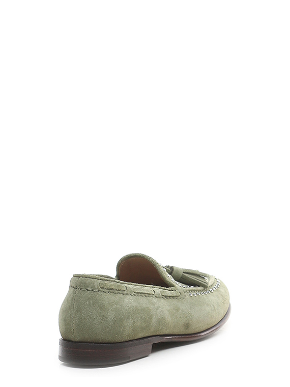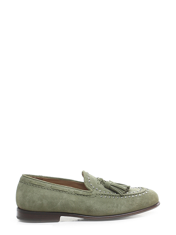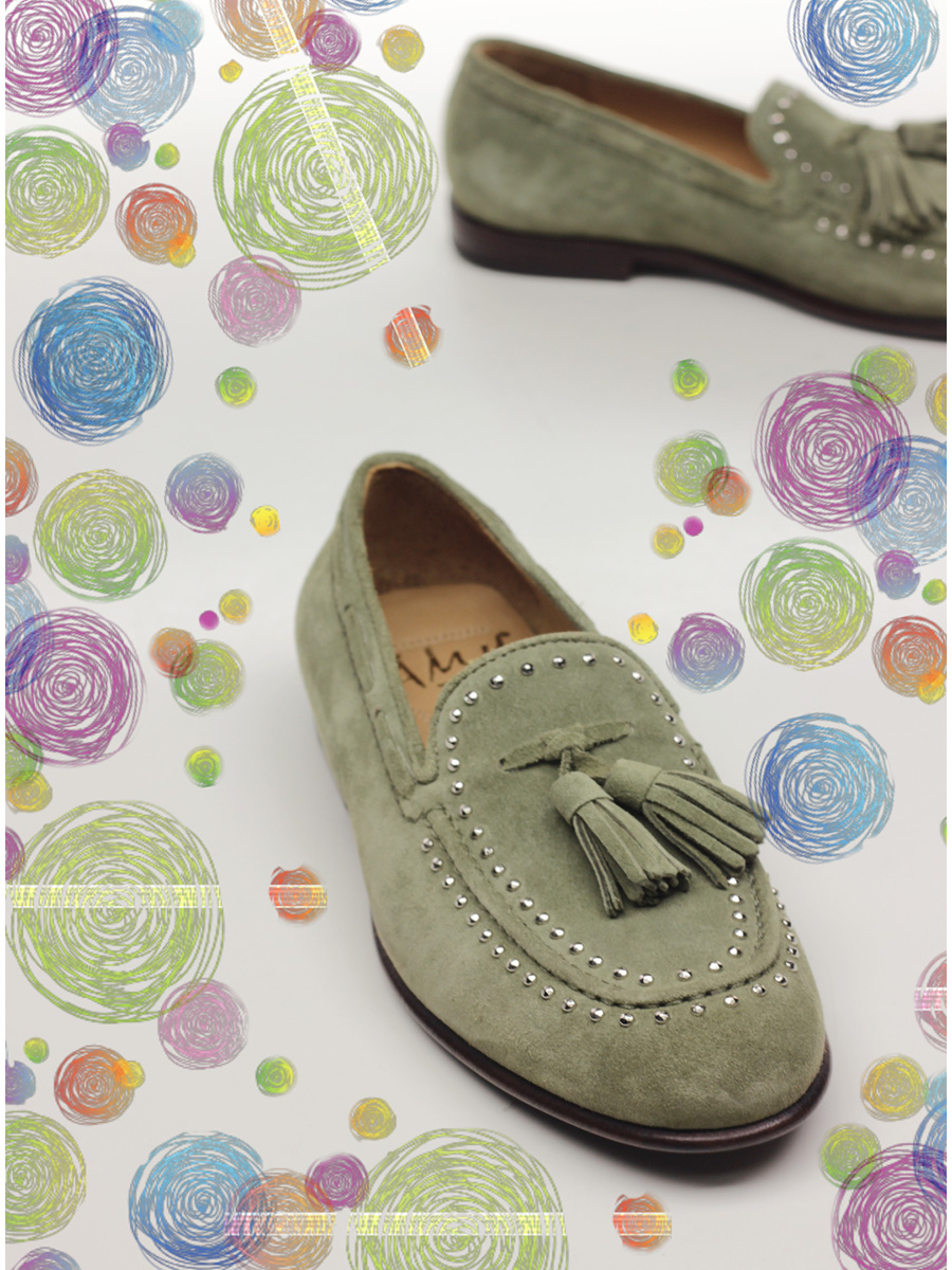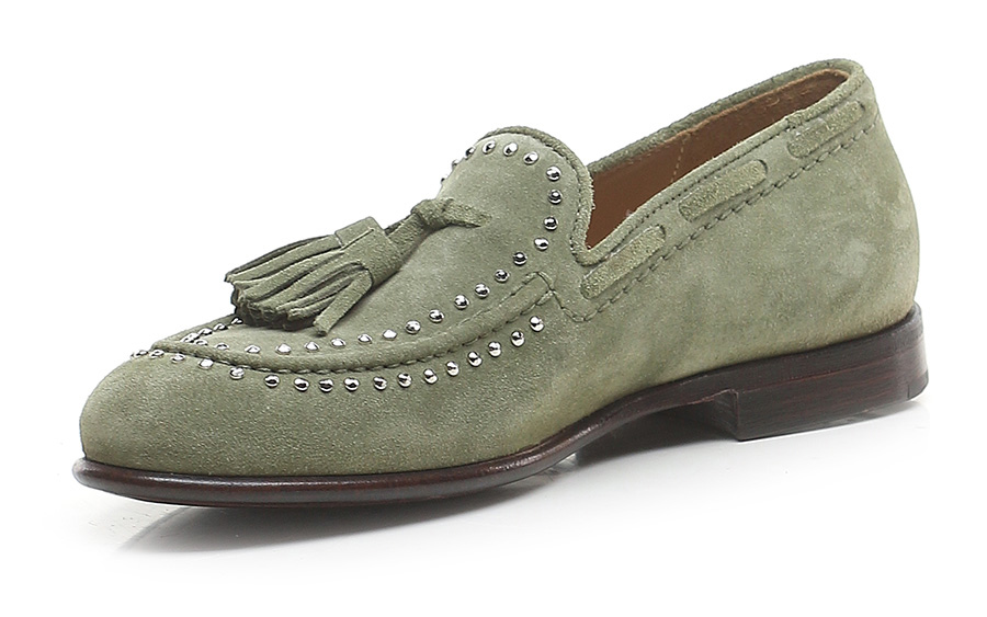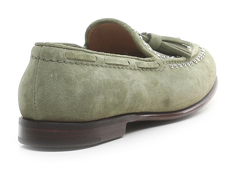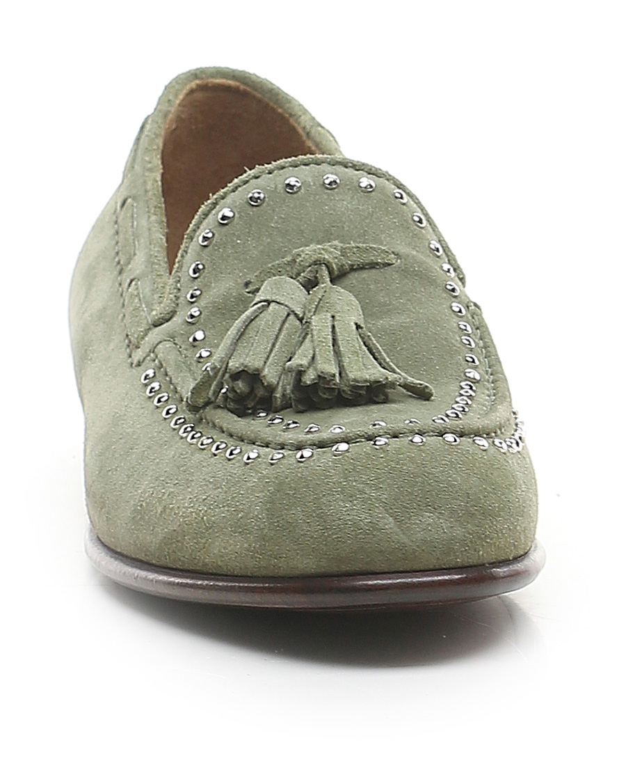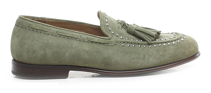 Wildledermokassin mit Quasten und Nieten vorne. Sohle aus Leder und Gummi. Absatzhöhe 20mm.