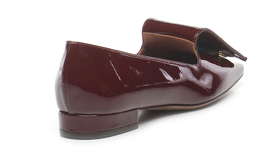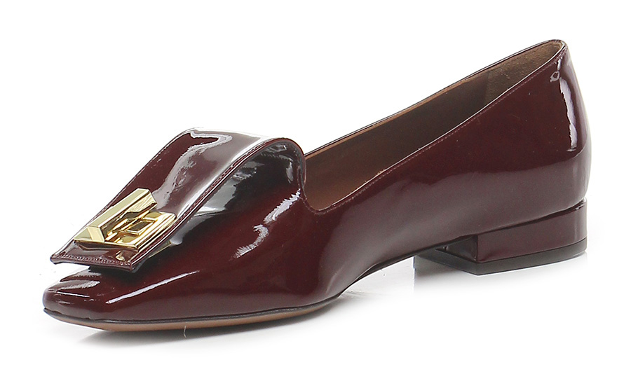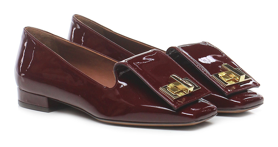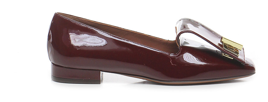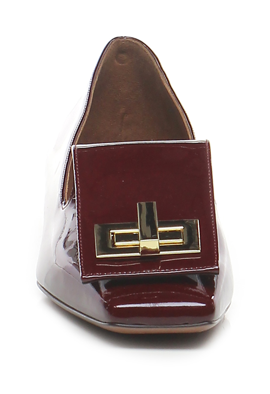 Halbschuh aus Lackleder mit vorderem Zubehör aus Stahl, Sohle aus Leder und Gummi. Absatz 20, mit Lackleder überzogen.