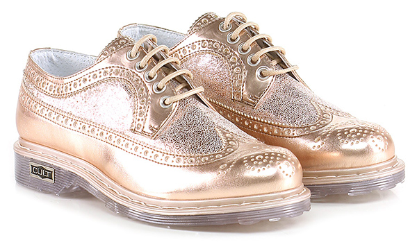 Scarpa bassa in pelle laminata effetto crack, pelle laminata ed eco pelle specchiata con lavorazione stile inglese e suola in gomma. Tacco 30, platform 15 con battuta 15.