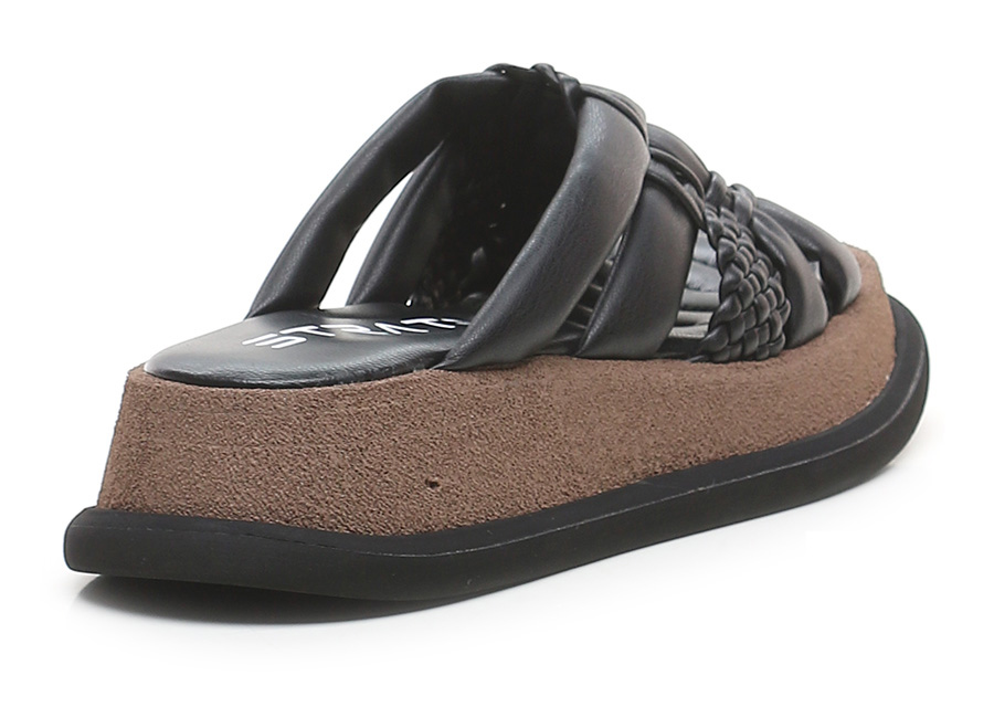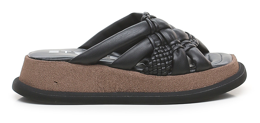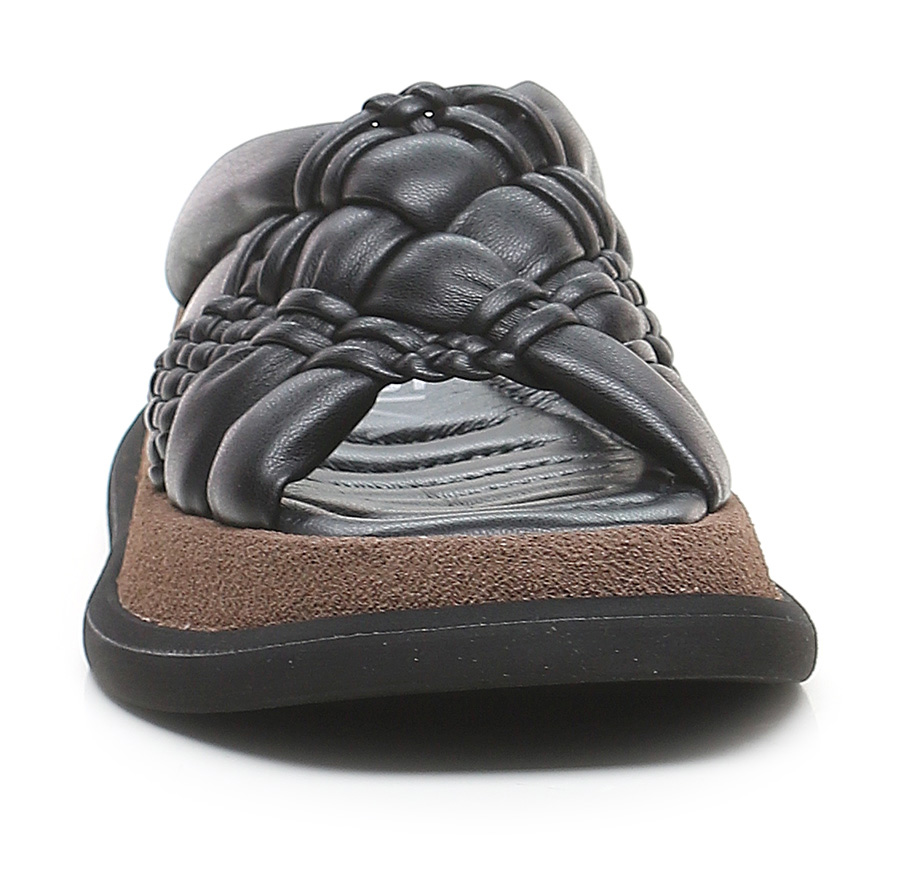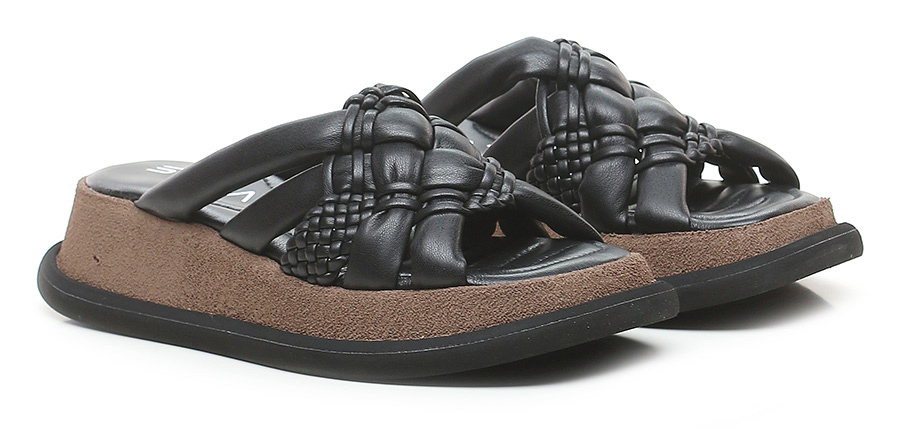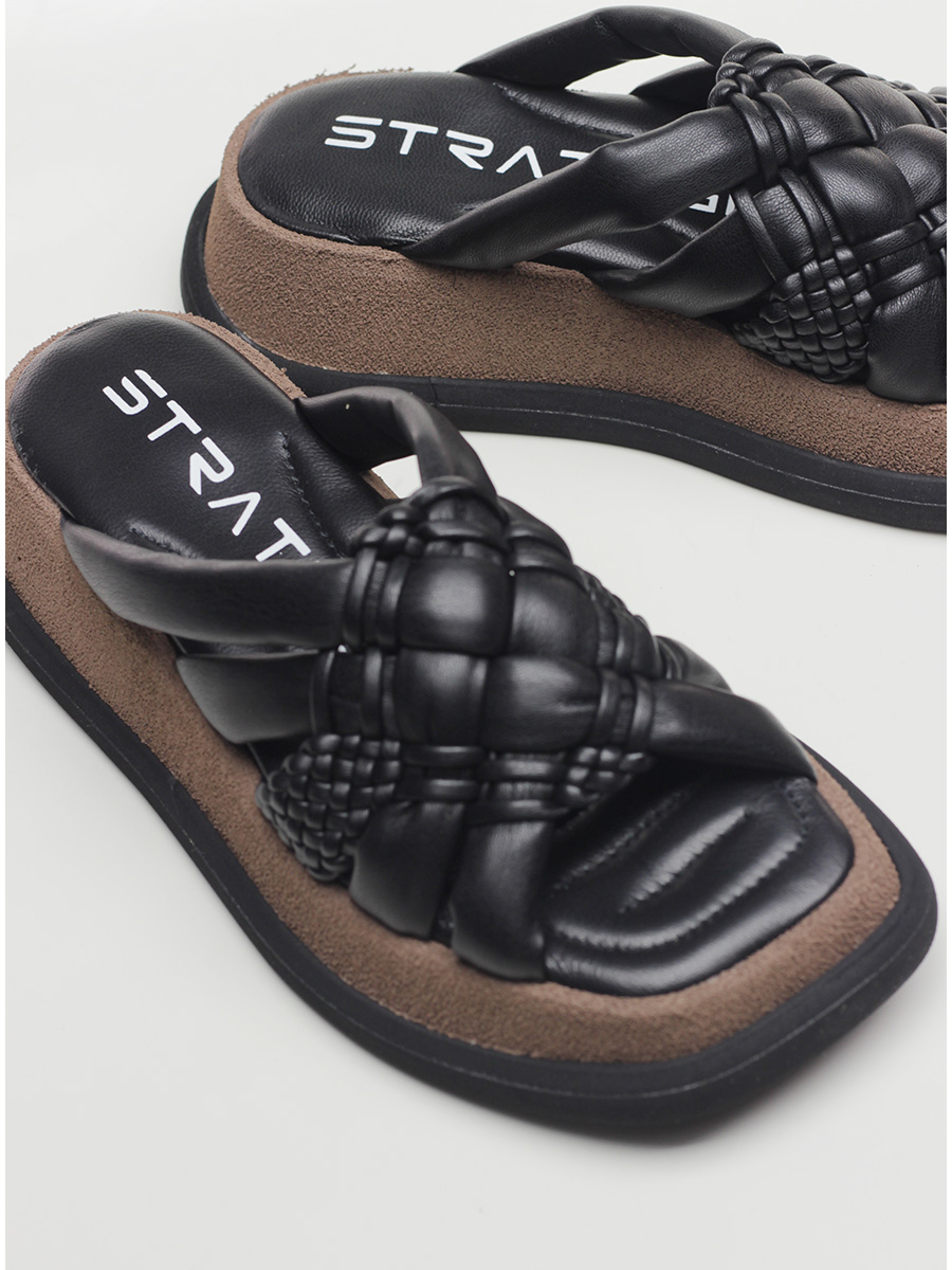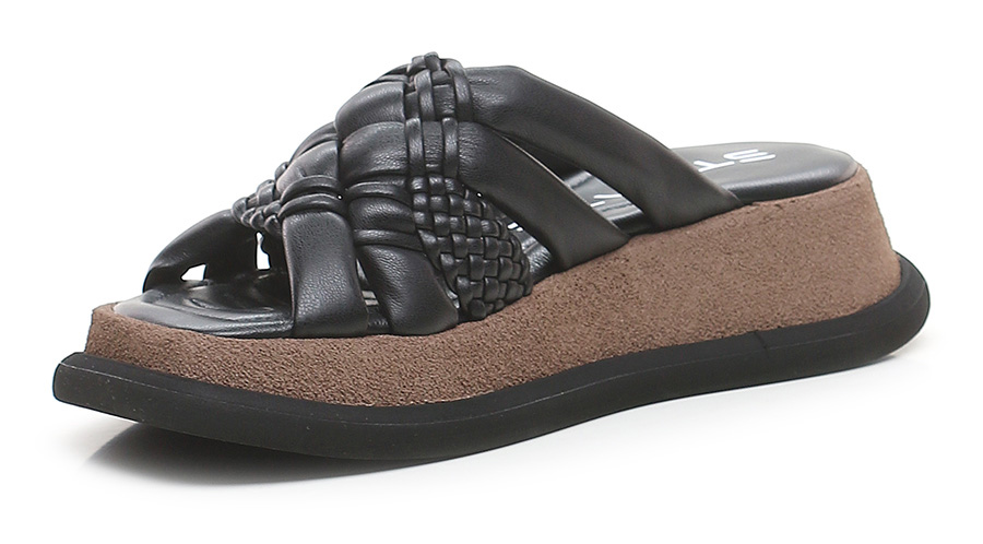 Sandale aus geflochtenem Leder mit Gummisohle. 45 mm Absatzhöhe, 30 mm Plateau mit 15 mm Absatz.