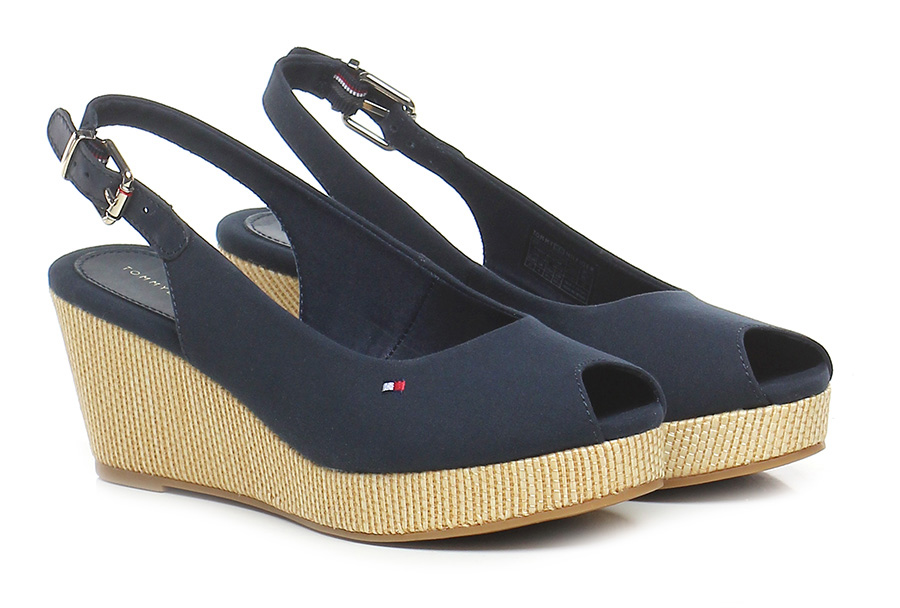 Zehenfreier Keilabsatz aus Stoff mit Ledereinsätzen, Gummisohle. Absatz 70, Plattform 25 mit Absatz 45. Keil mit Seil bedeckt.