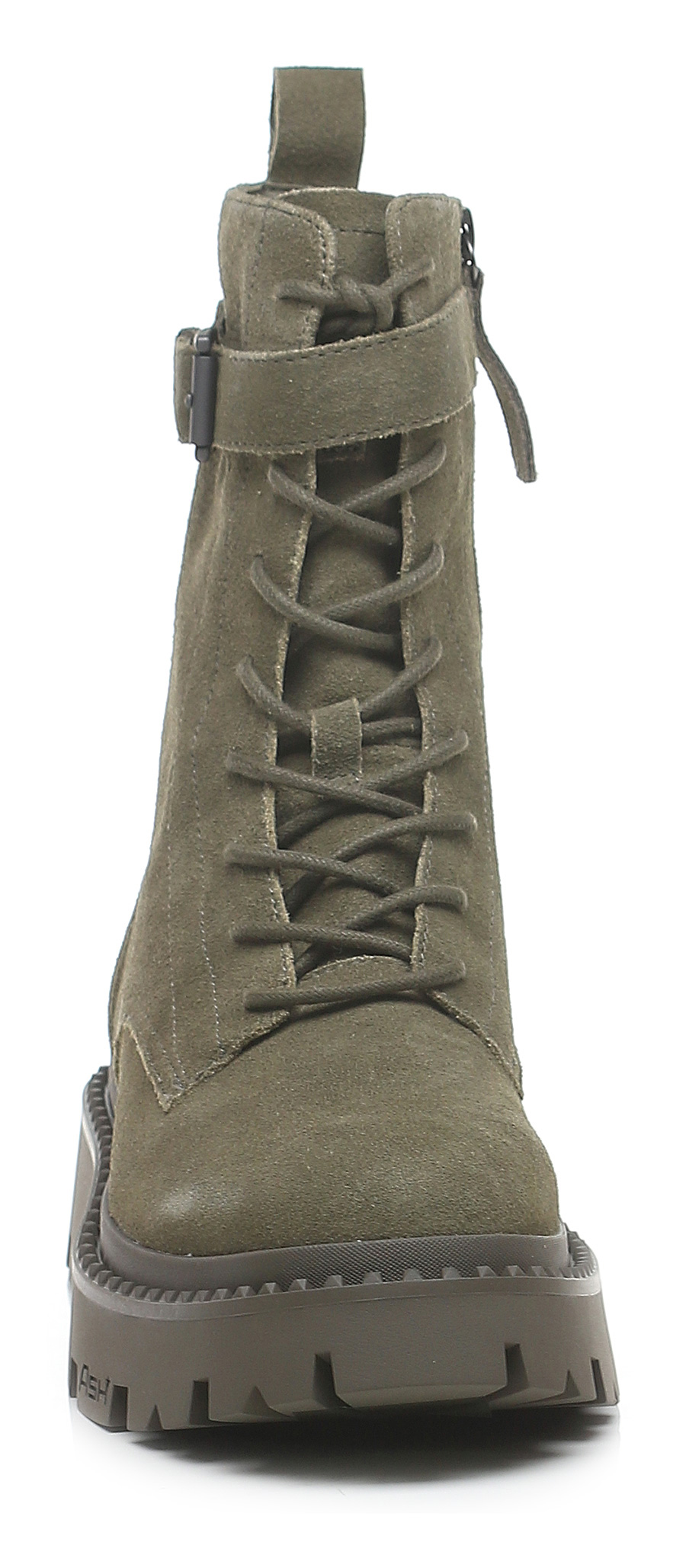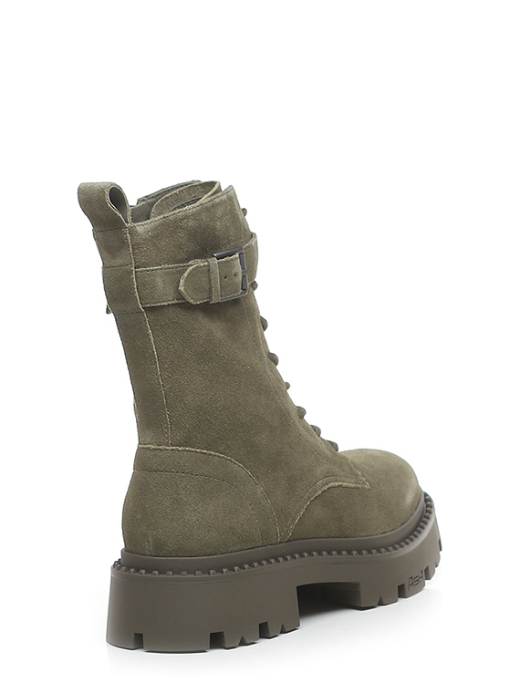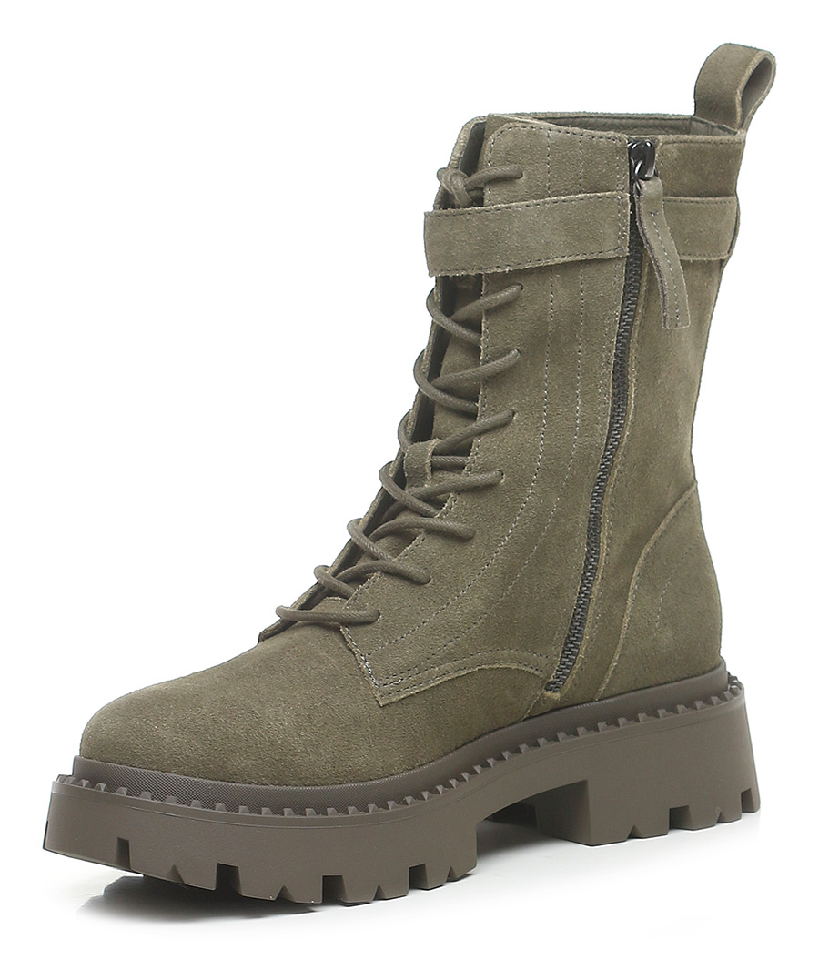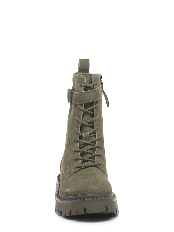 Wildlederstiefelette mit seitlichem Reißverschluss und Riemen. Gummisohle. 50 mm Absatzhöhe, 35 mm Plateau mit 15 mm Absatz.
