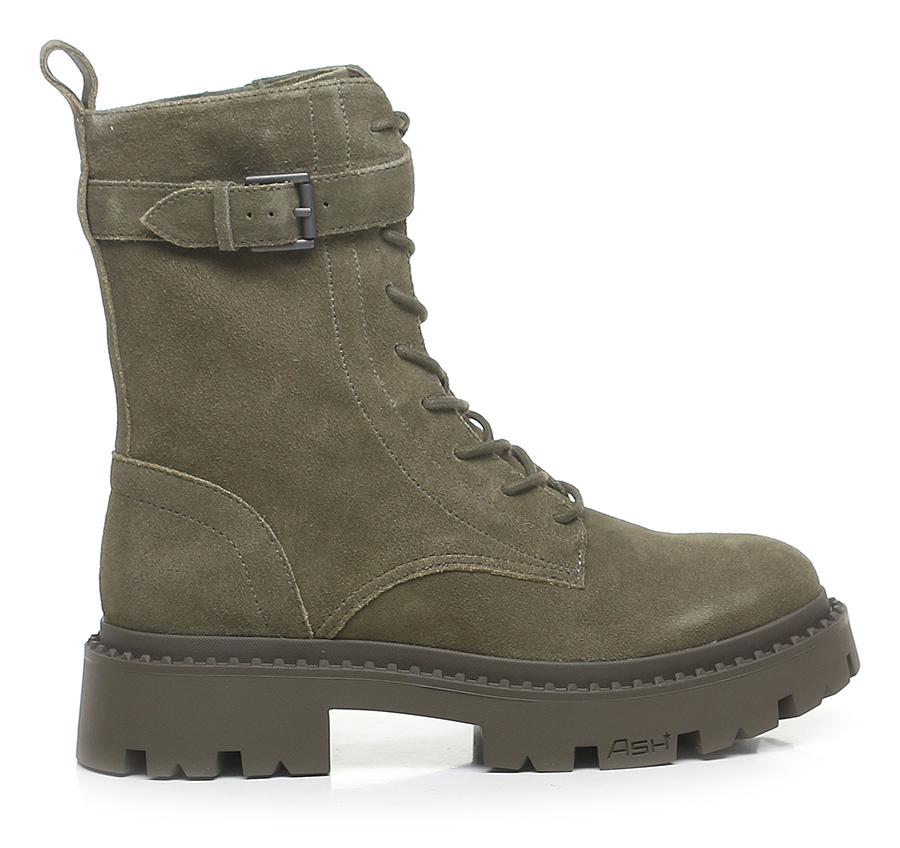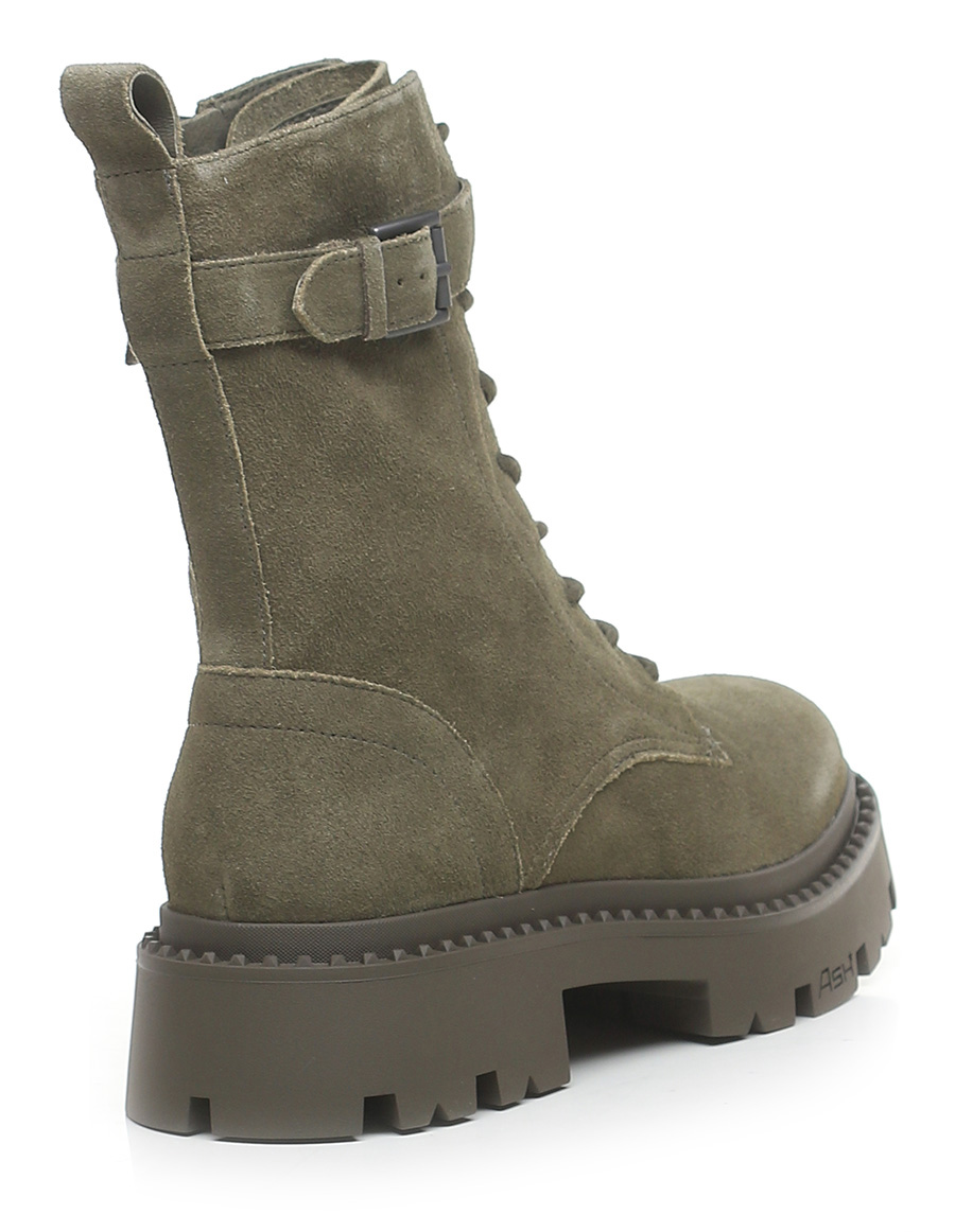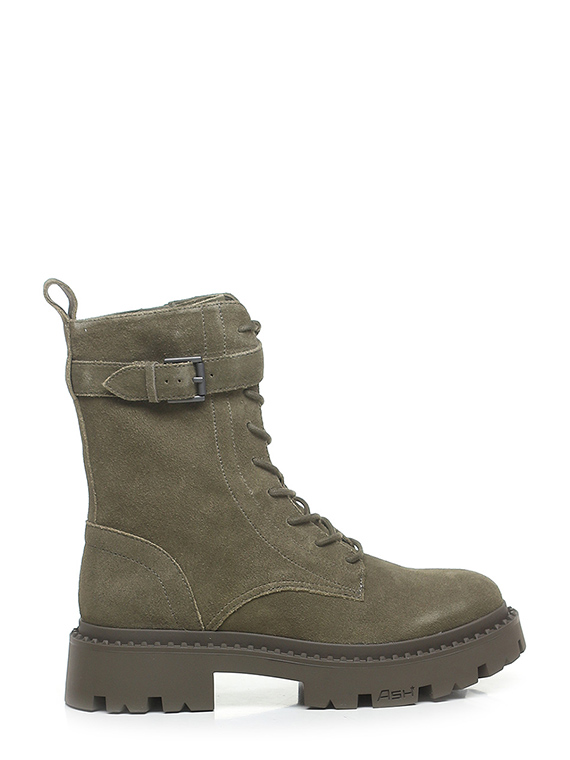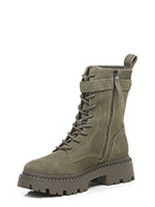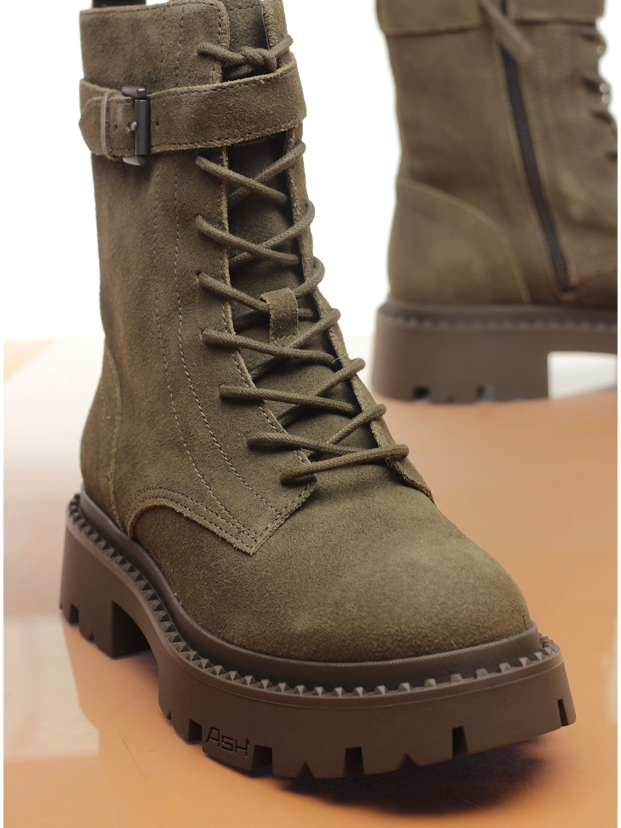 Wildlederstiefelette mit seitlichem Reißverschluss und Riemen. Gummisohle. 50 mm Absatzhöhe, 35 mm Plateau mit 15 mm Absatz.