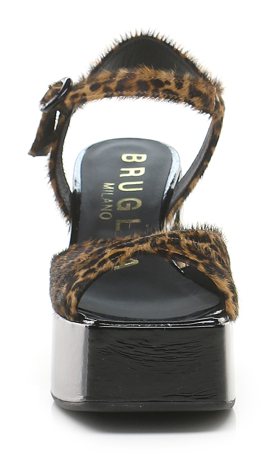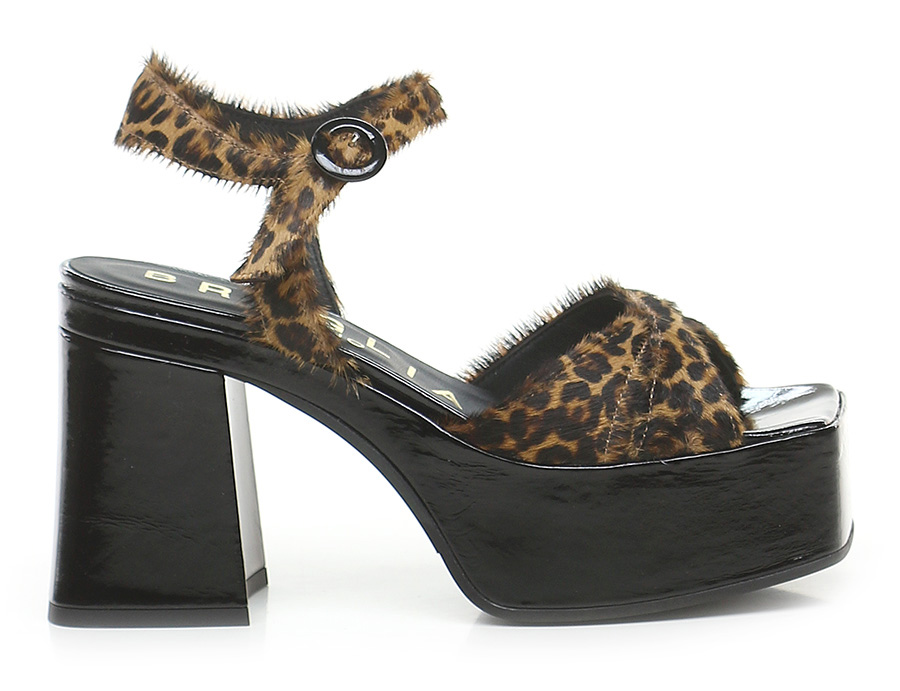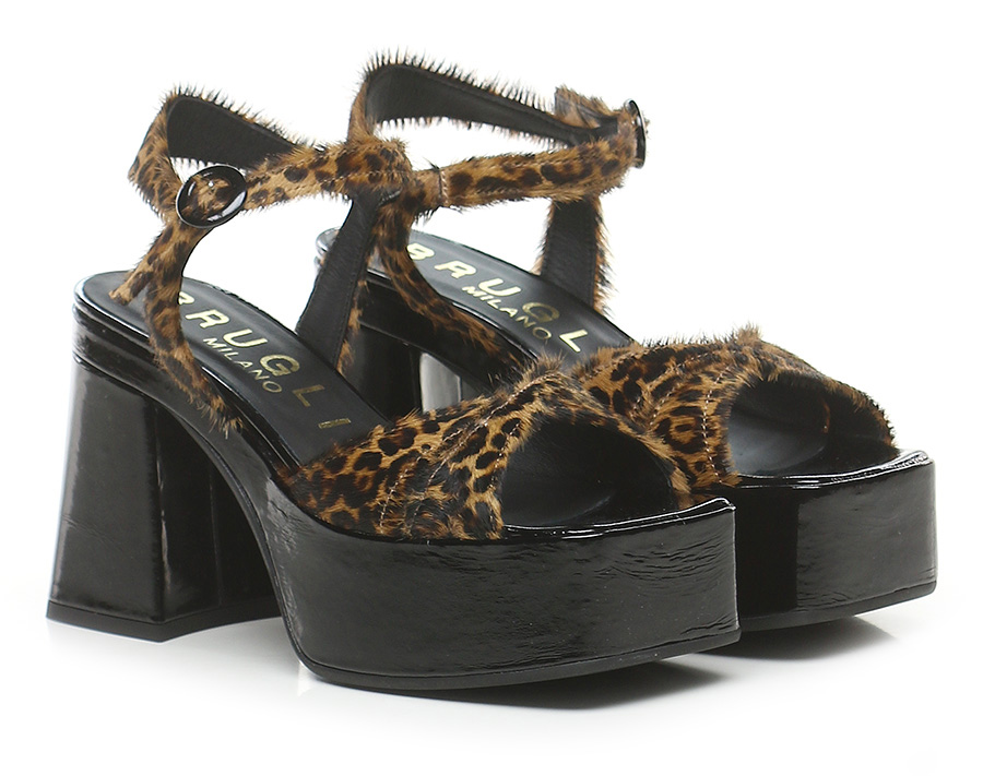 Sandale aus Kalbshaar und Lackleder mit Gummisohle. Absatzhöhe 105 mm, Plateau 50 mm mit 55 mm Absatz. Absatz mit Lackfutter.