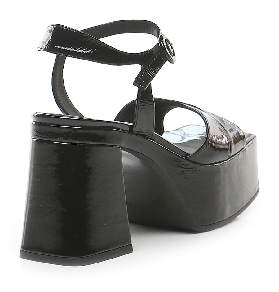 Lacksandale mit Fesselriemchen und Gummisohle. Absatzhöhe 105 mm, Plateau 50 mm mit 55 mm Absatz. Absatz mit Lackfutter.