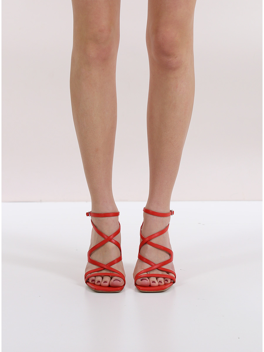 Ledersandale mit vorderem gekreuzten Knöchelriemen und Ledersohle. Absatzhöhe 100mm. Absatz aus PVC mit mattem Effekt.