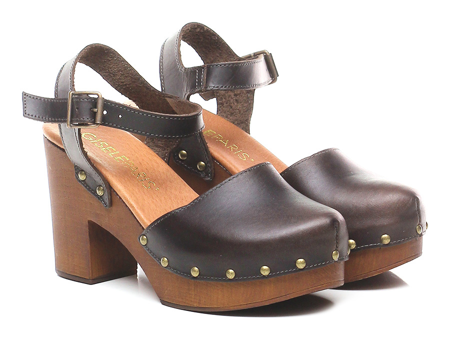 Sandalo alto in pelle con cinturino alla caviglia e borchie a rivetto su tomaia e suola. Suola in gomma. Tacco 100, platform 40 con battuta 60. Suola effetto legno.