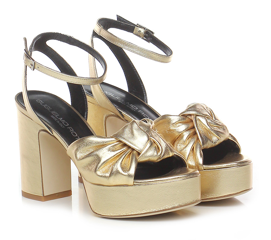 Sandalo alto in pelle laminata con cinturino alla caviglia, suola in cuoio. Tacco 105, platform 40 con battuta 65.