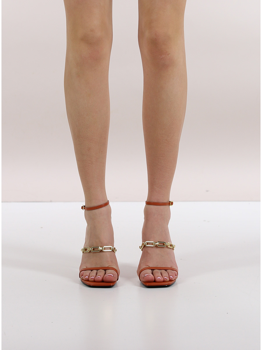 Kunstledersandale mit Knöchelriemchen und goldener Frontkette. Gummisohle. Absatzhöhe 110mm.