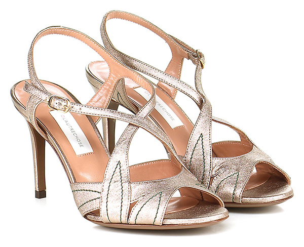 Sandalo alto in pelle laminata con cinturino su retro ad incrocio frontale e suola in cuoio. Tacco 100.