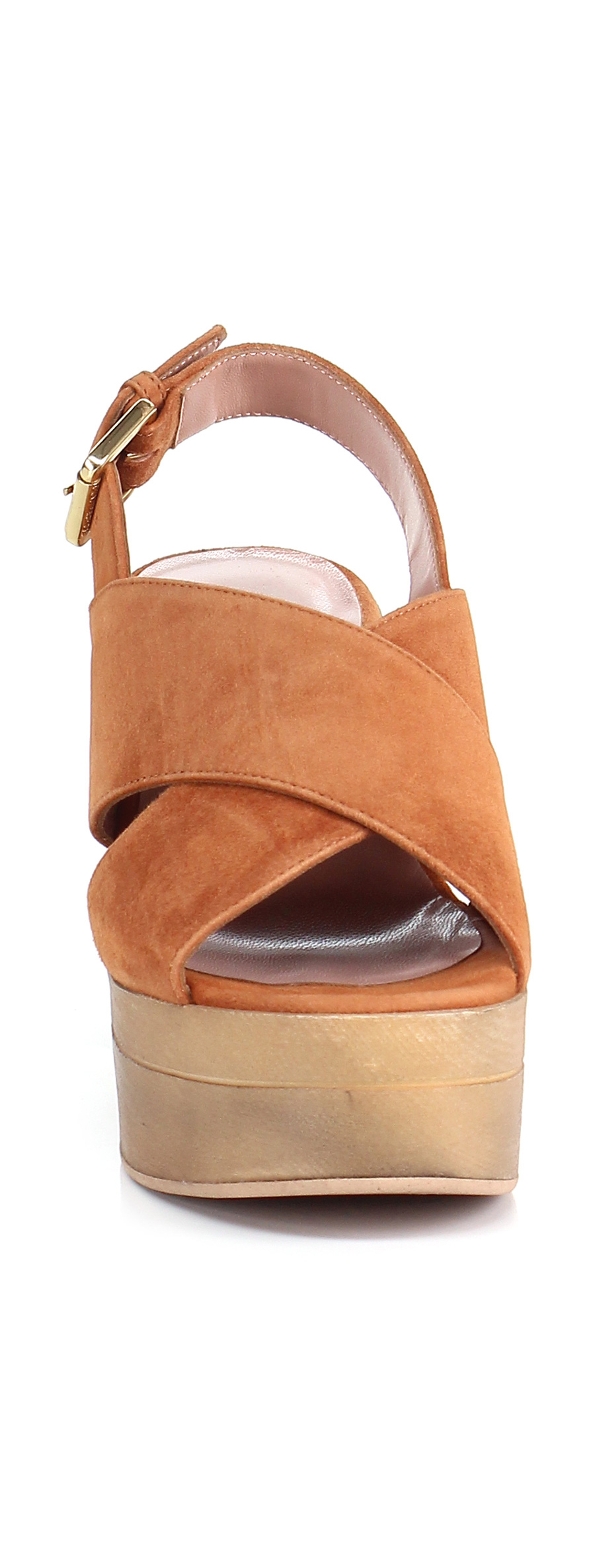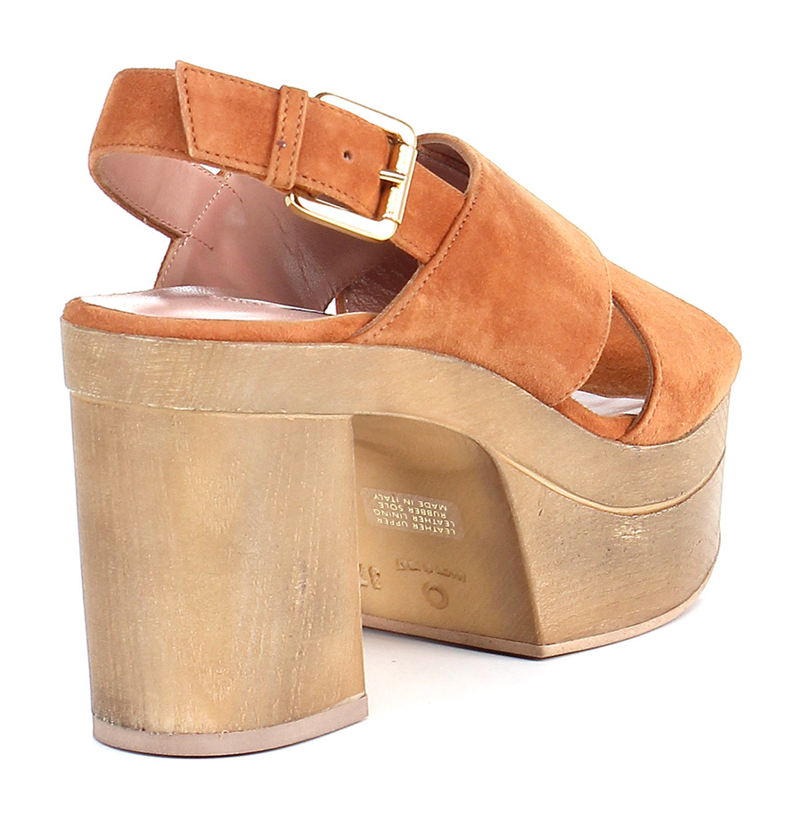 Hohe Wildledersandale mit Riemchen und Gummisohle. 100 Absatz, 50 Plateau mit 50 Absatz.