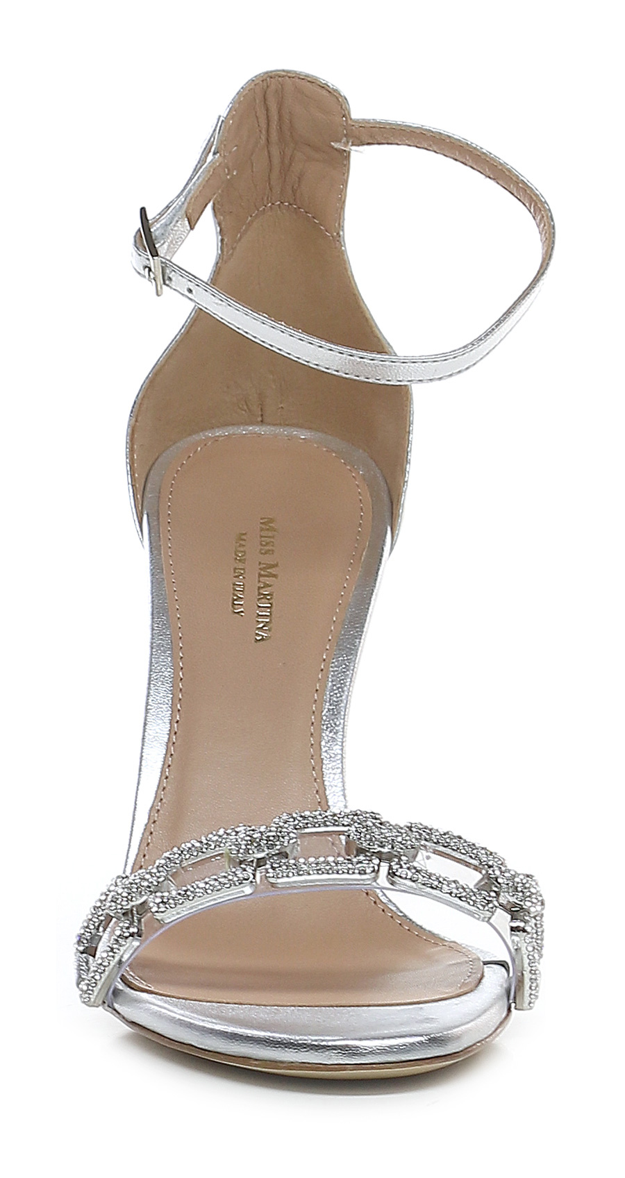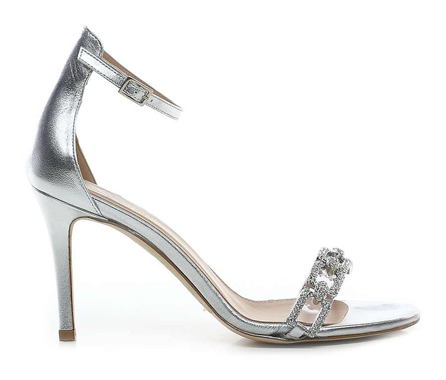 Sandale aus laminiertem Leder mit Knöchelriemen. Frontband aus PVC mit Strasskettenapplikation. Ledersohle, Absatzhöhe 90mm. Ferse mit laminiertem Leder gefüttert.