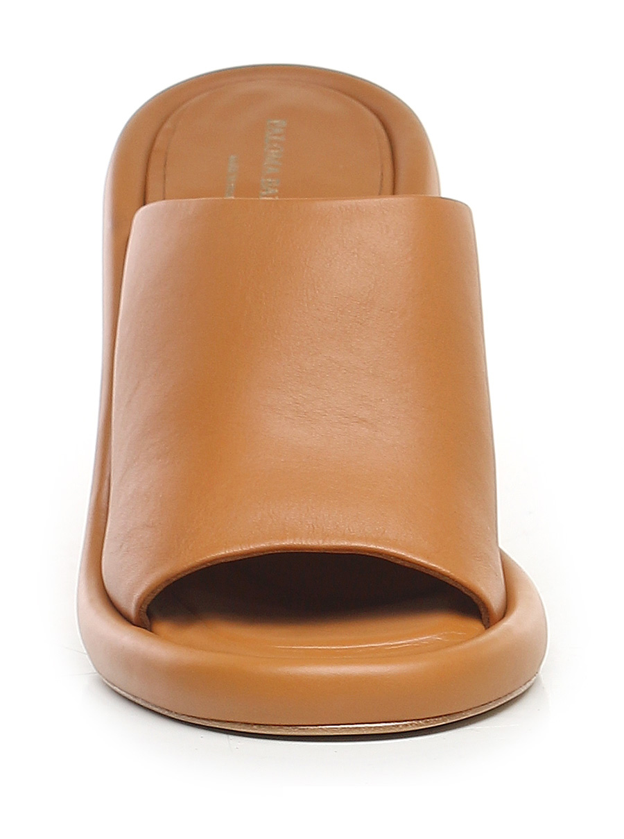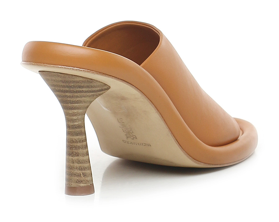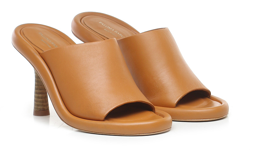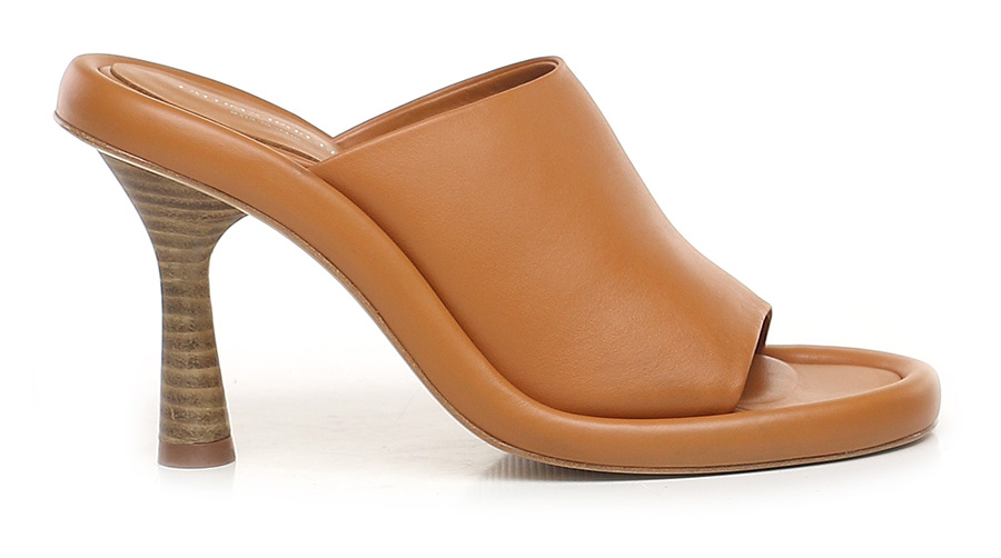 Ledersandale mit Leder- und Gummisohle. Absatzhöhe 115 mm, Plateau 15 mm mit 100 mm Absatz. Spulenabsatz in Holzoptik.