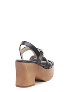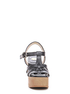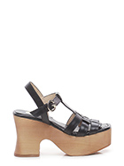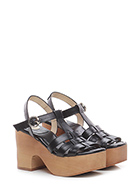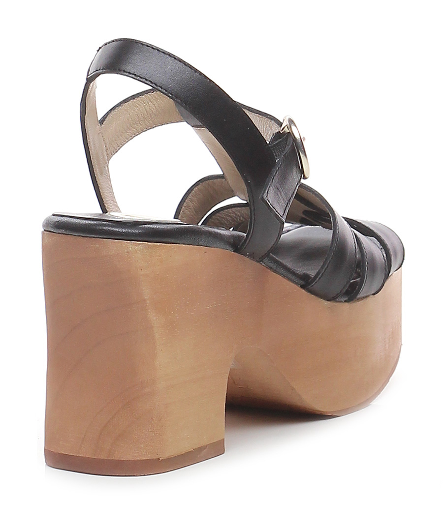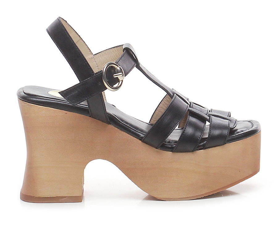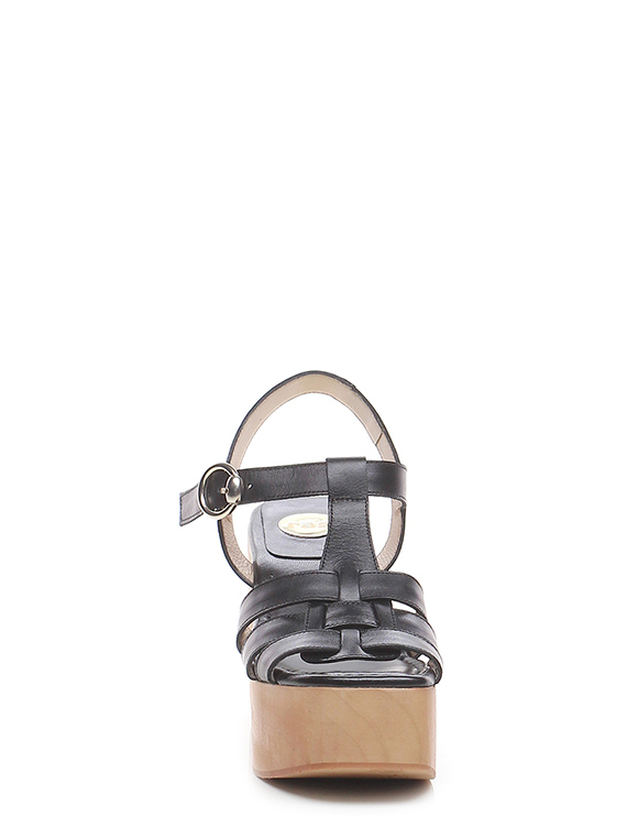 Hohe Ledersandale mit Knöchelriemen, Gummisohle. Absatz 100, Plateau 50 mit Absatz 50. Plateau und Absatz in Holzoptik.