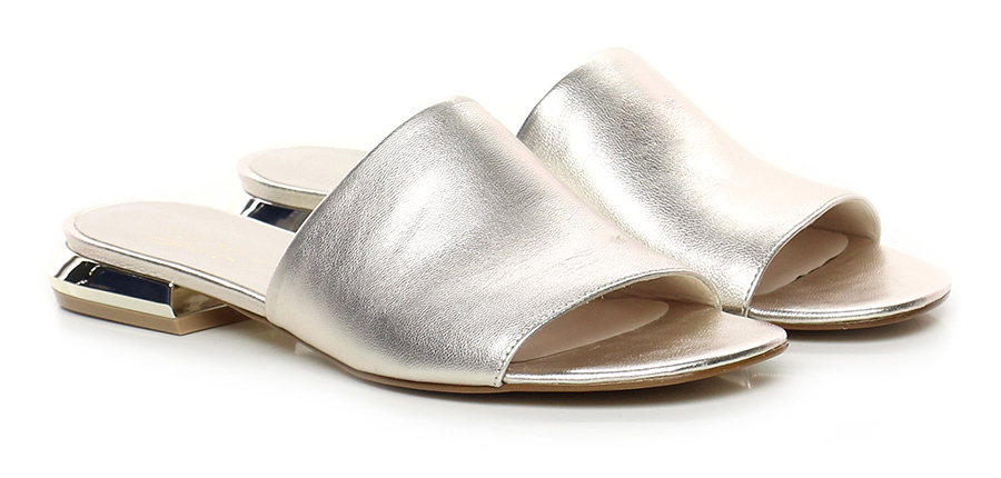 Sandalo basso in pelle laminata, suola in gomma. Tacco 25, effetto metallo.