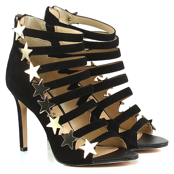 Scarpa con tacco in camoscio con zp su retro ed applicazioni metalliche. Suola in gomma, tacco 100.