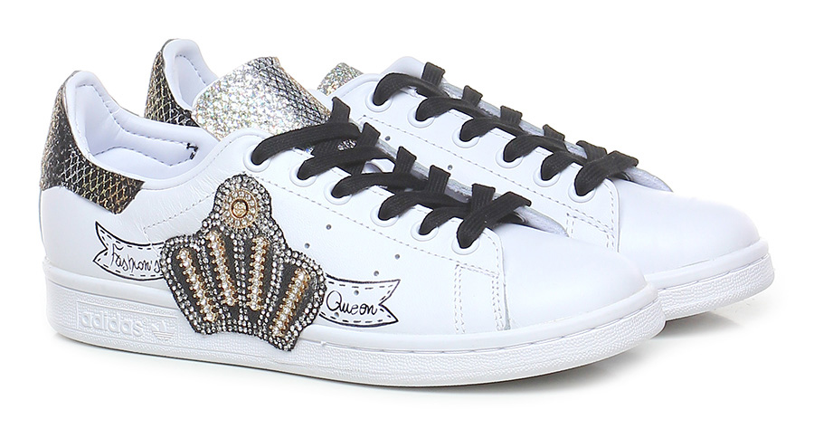 Ledersneaker mit Glitzereinsätzen mit Strassapplikationen außen, Gummisohle. Sohlenhöhe: 25, Plattform 15 mit Absatz 10.