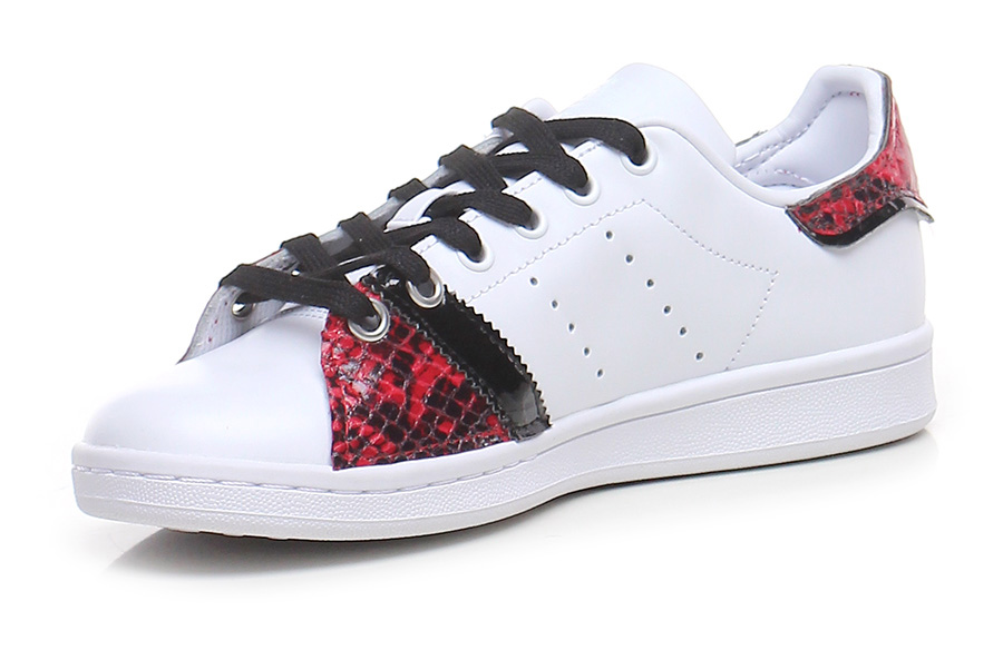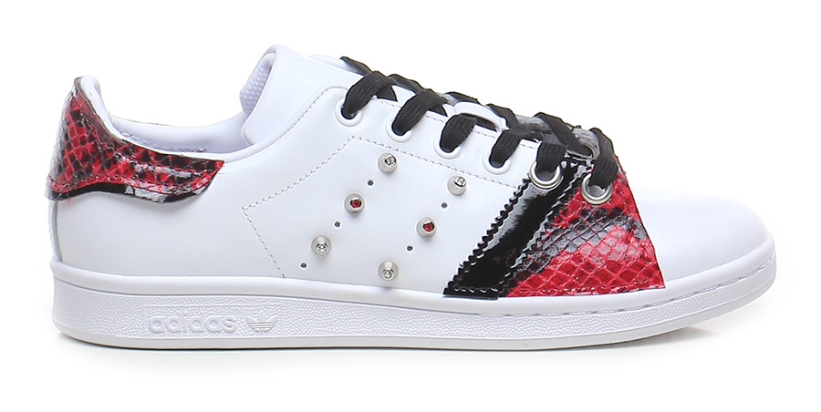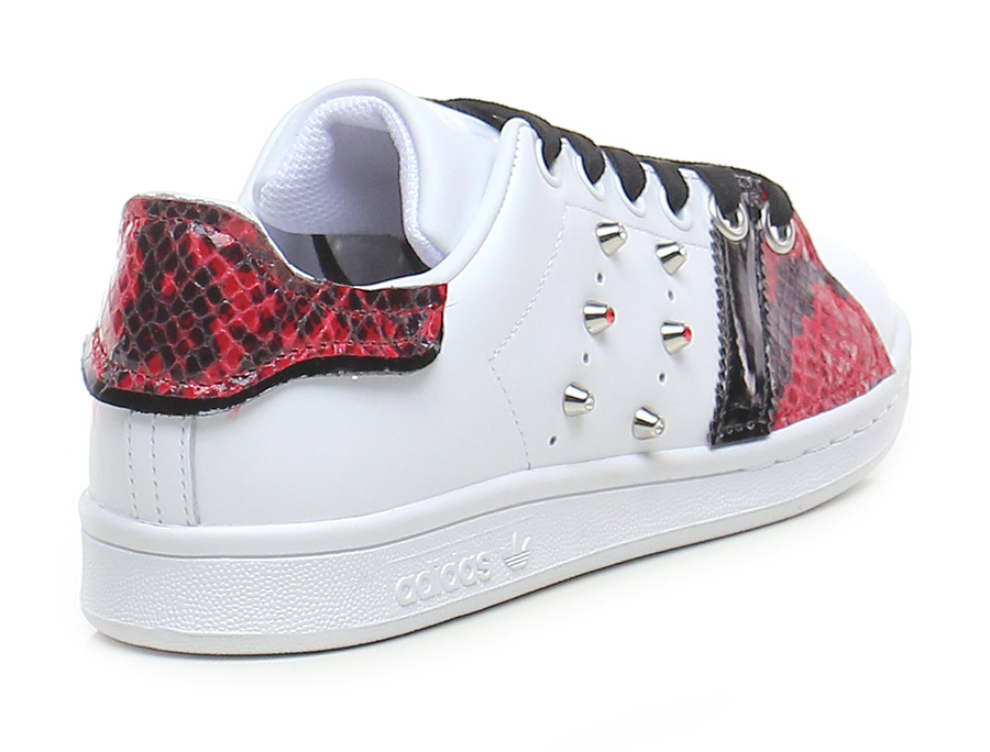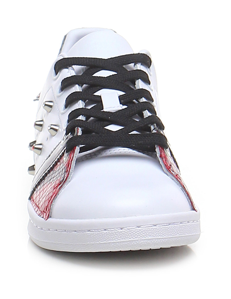 Sneaker Stan Smith aus Leder mit Einsätzen aus Python, Lackleder und Nieten. Gummisohle. Sohlenhöhe: 25, Plateau 20 mit Absatz 5. Schnürsenkel aus Satin.