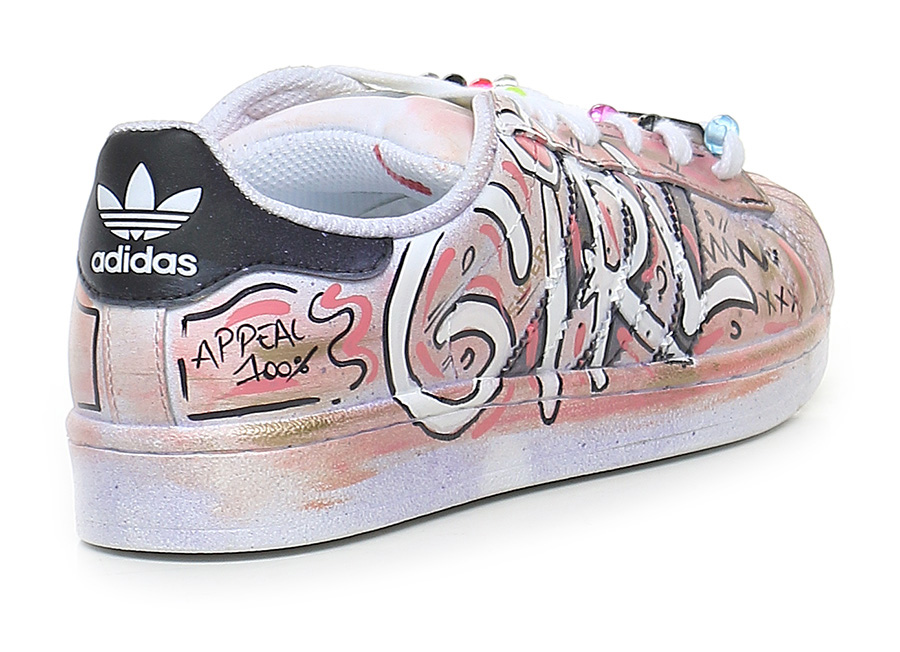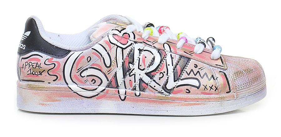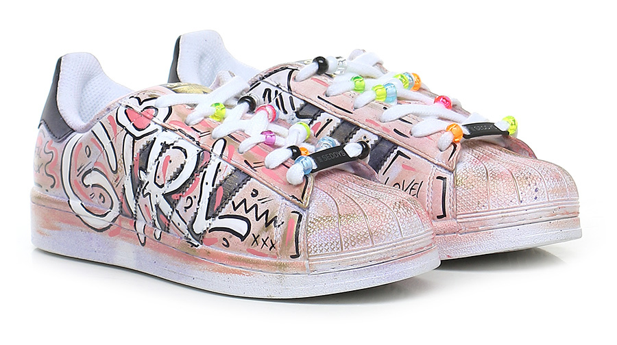 Ledersneaker mit Graffiti auf dem Obermaterial. Gummisohle: 25 mm Absatzhöhe, 15 mm Plateau mit 5 mm Absatz.