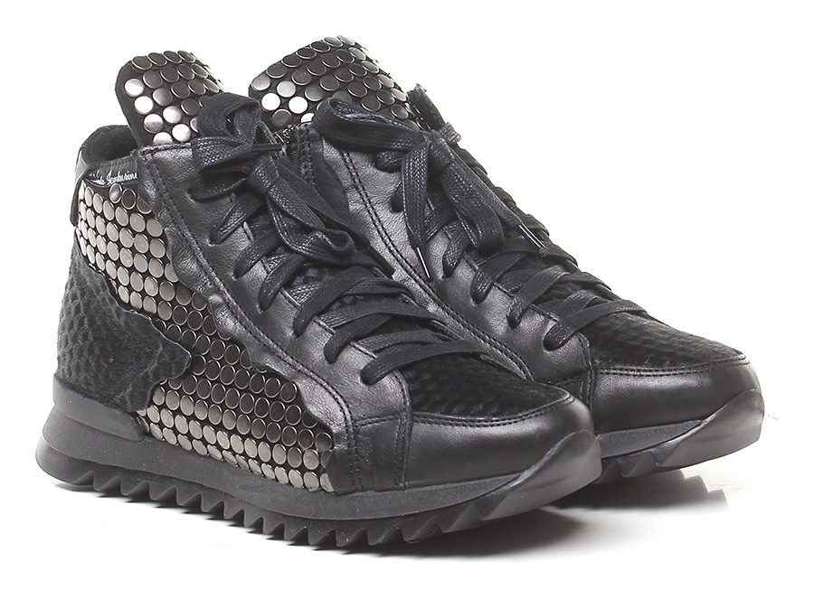 Sneaker in pelle vintage e tessuto con zip su lato interno e borchie su tomaia. Suola in gomma, tacco 40, platform 25 con battuta 15. Zeppa interna 25.