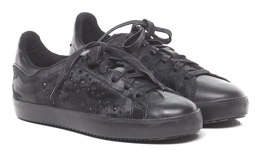 Sneaker in pelle e cavallino con strass su lato esterno. Suola in gomma, tacco 25.