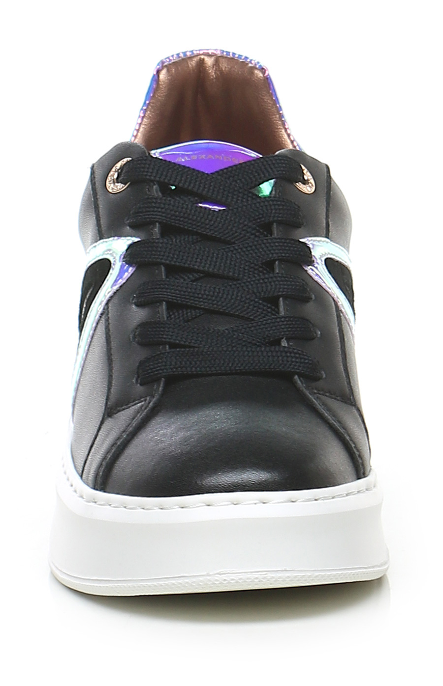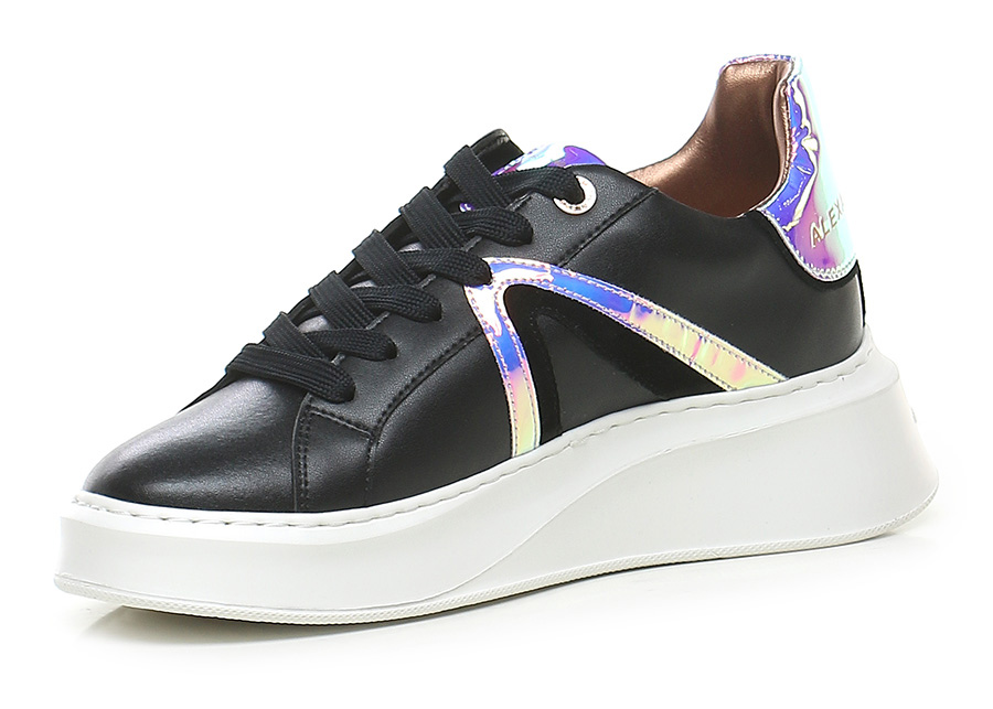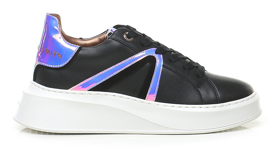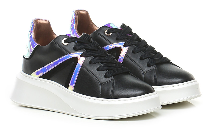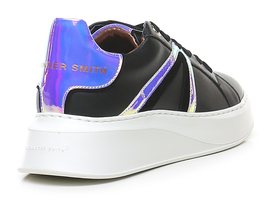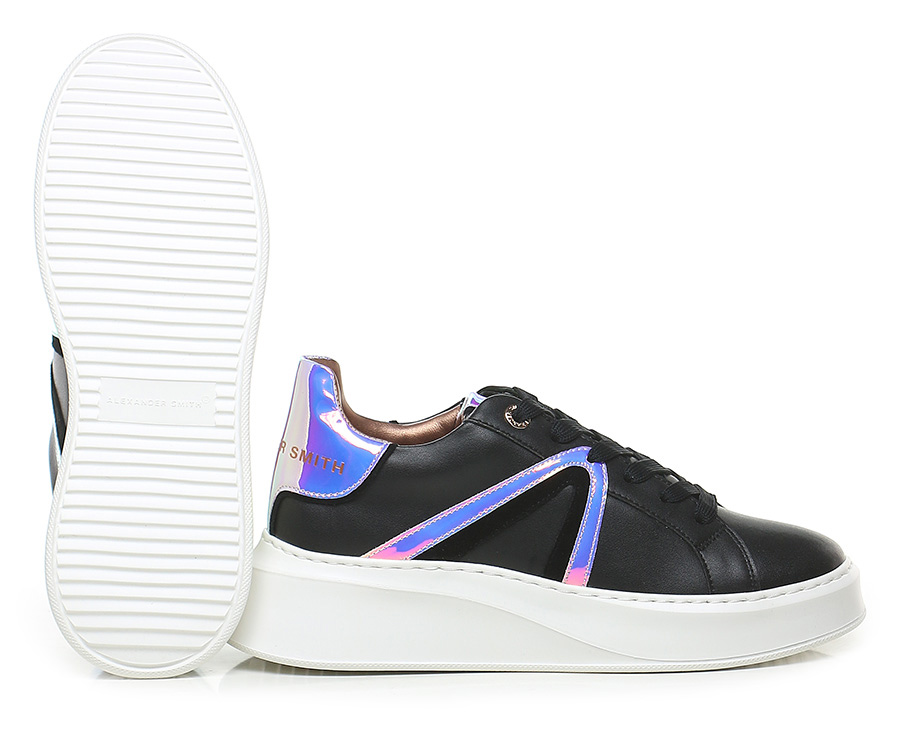 Ledersneaker mit verspiegelten Ledereinsätzen. Gummisohle. 45 mm Absatzhöhe, 30 mm Plateau mit 15 mm Absatz.