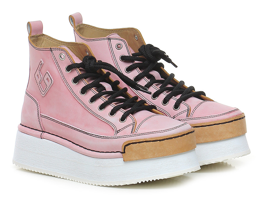 Sneaker in pelle effetto vintage, suola in gomma oversize. Altezza tacco 50mm, platform 40mm con battuta 10mm.