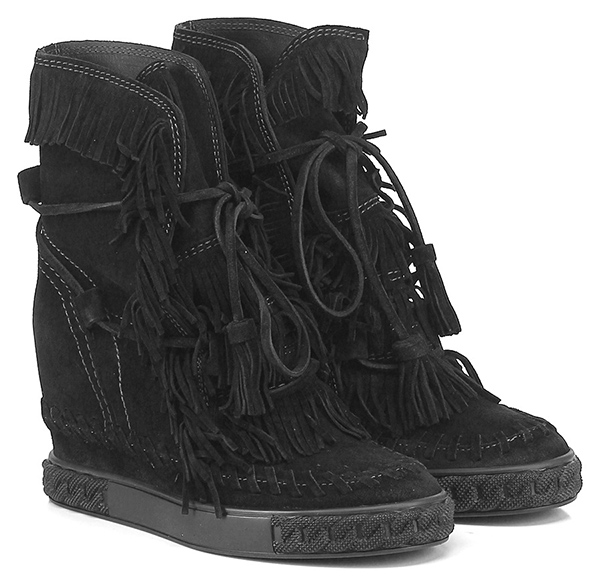 Sneaker in pelle di renna con frange su tomaia, cuciture a vista, allacciatura frontale e nappine. Suola in gomma lavorata, tacco 100, platform 25 con battuta 75.