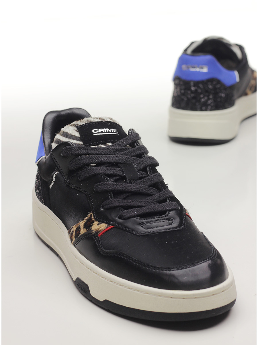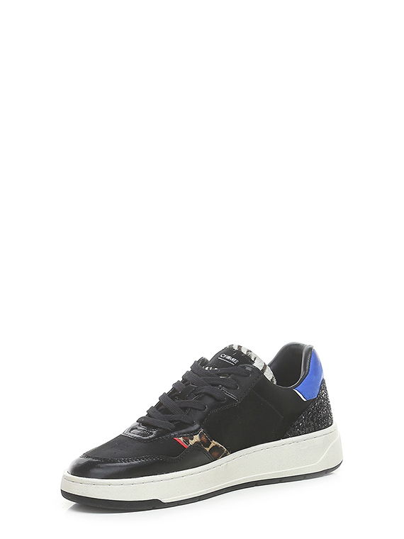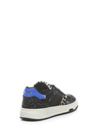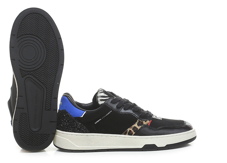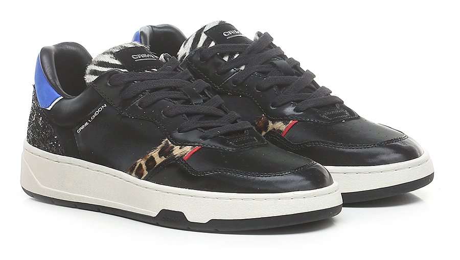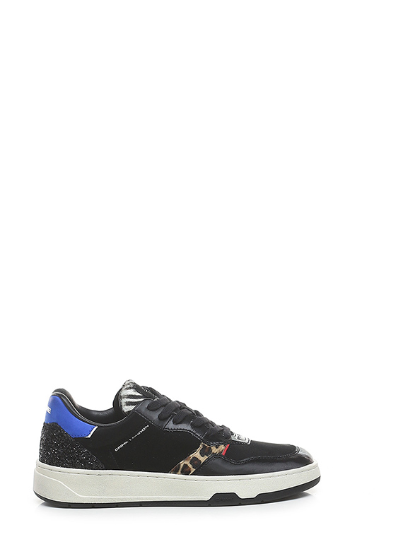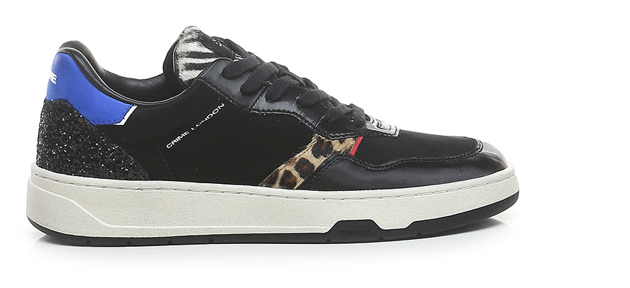 Stoff-Sneaker mit Einsätzen aus Leder und Leder in Pony-Optik und glitzernder Fersenlasche. Gummisohle mit Vintage-Effekt. 35 mm Absatzhöhe, 25 mm Plateau mit 10 mm Absatz.