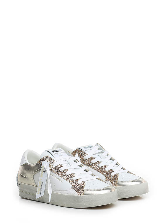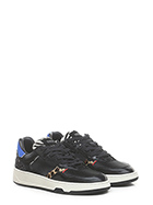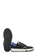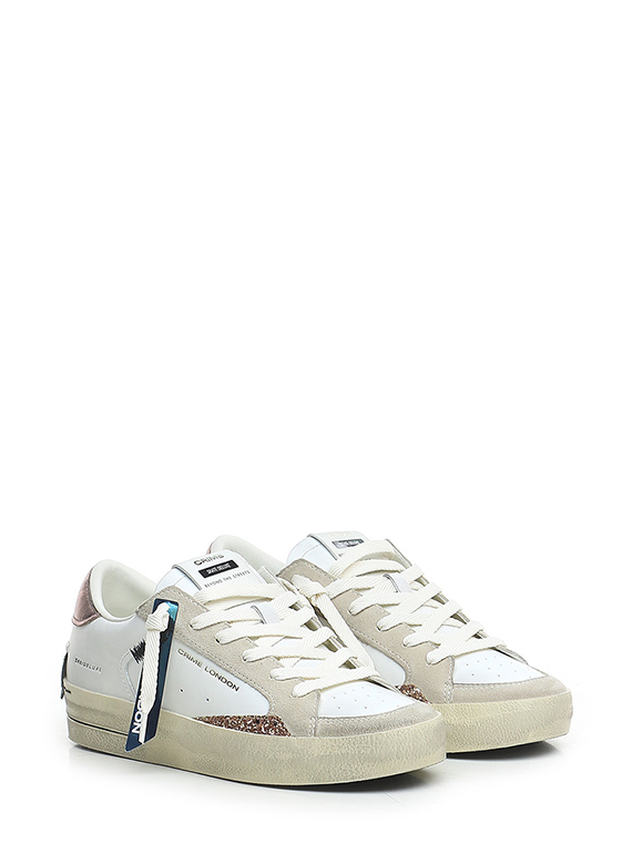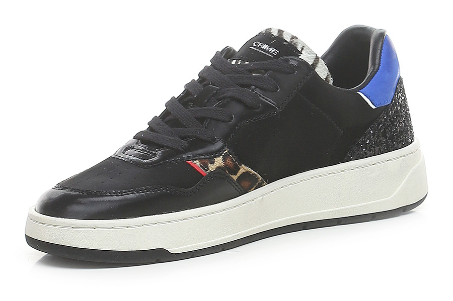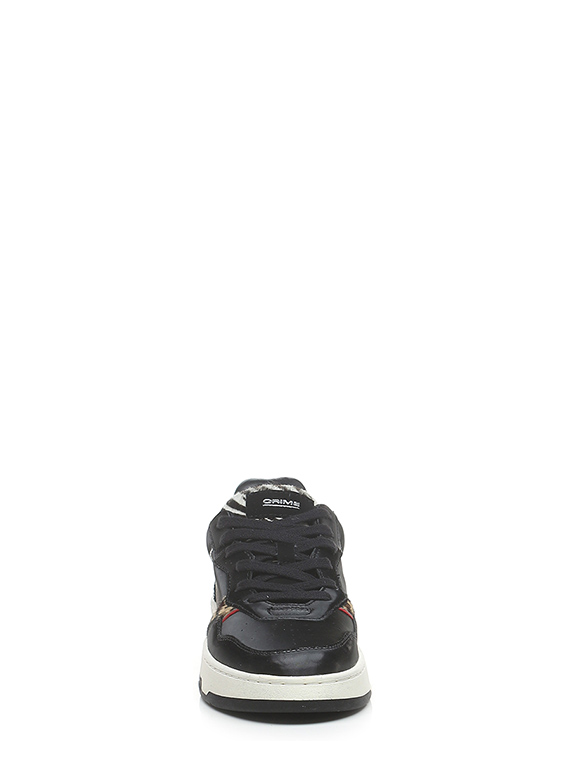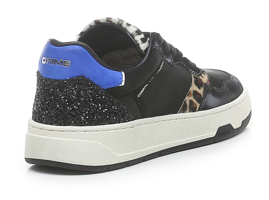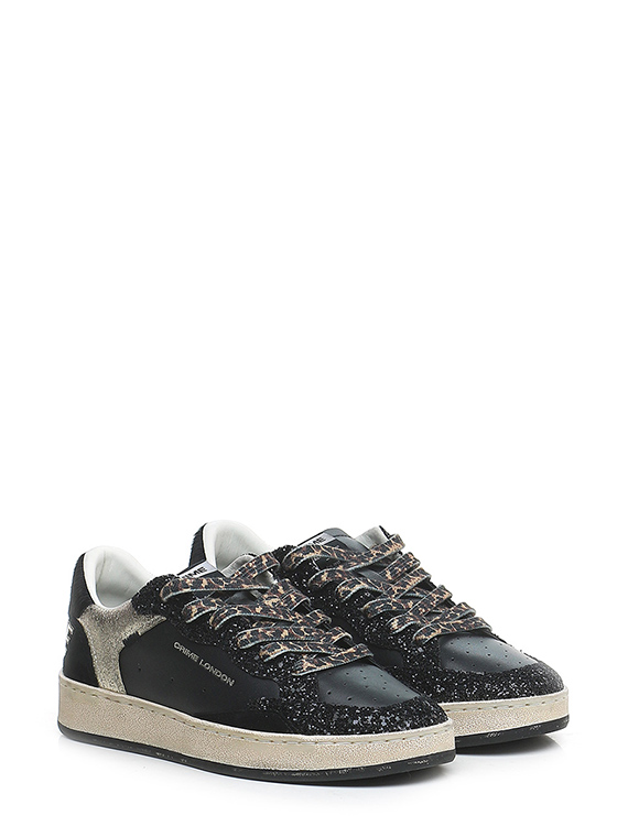 Stoff-Sneaker mit Einsätzen aus Leder und Leder in Pony-Optik und glitzernder Fersenlasche. Gummisohle mit Vintage-Effekt. 35 mm Absatzhöhe, 25 mm Plateau mit 10 mm Absatz.