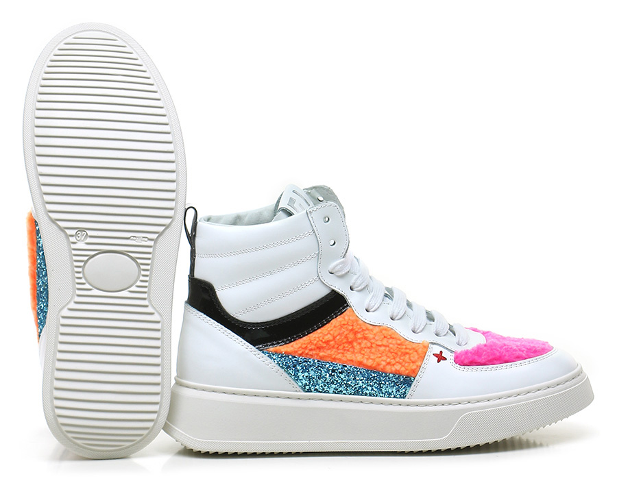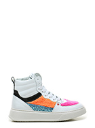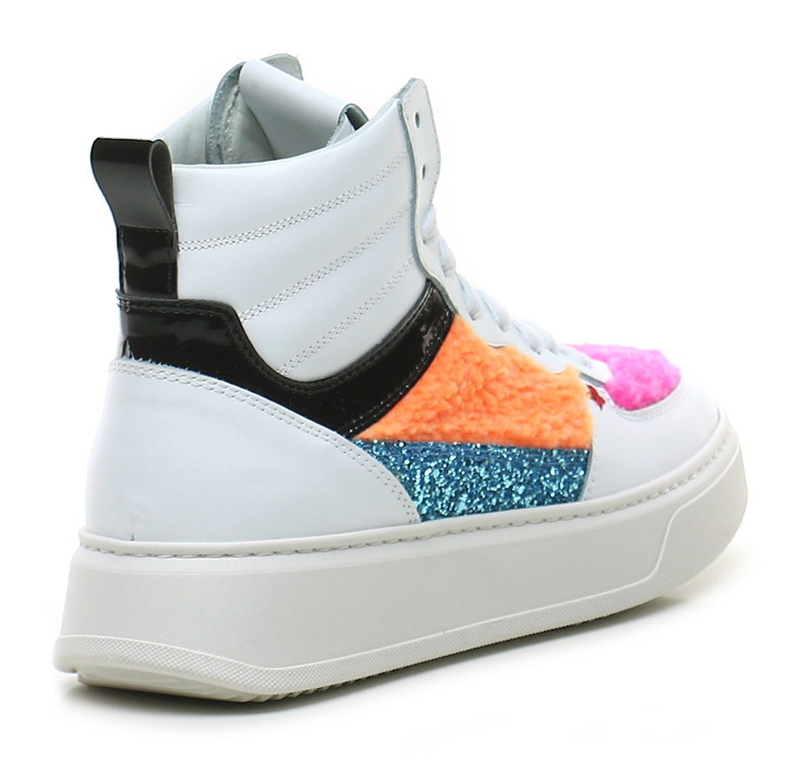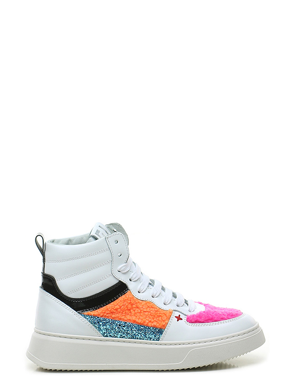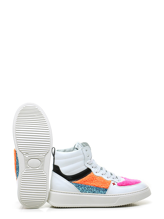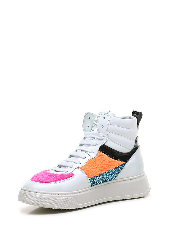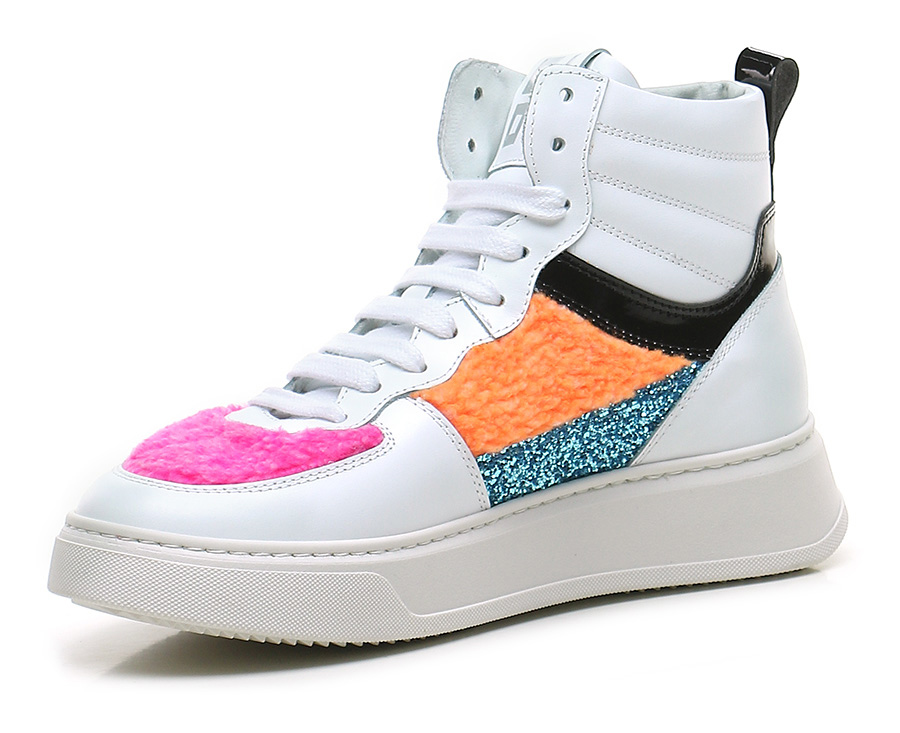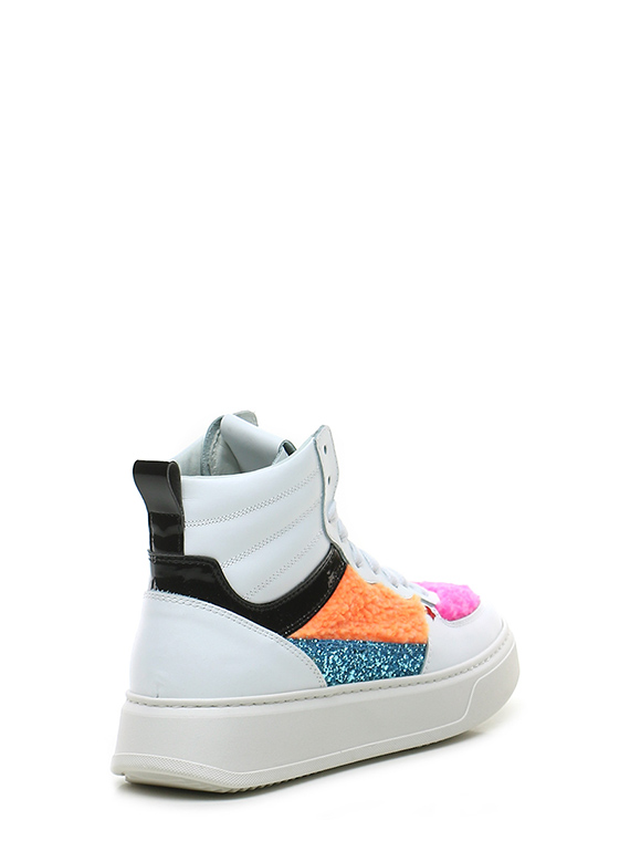 Ledersneaker mit Stoff-, Lack- und Glitzereinsätzen. Gummisohle. 40 mm Absatzhöhe, 30 mm Plateau mit 10 mm Absatz.