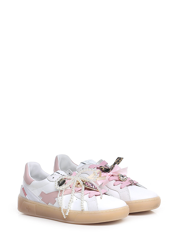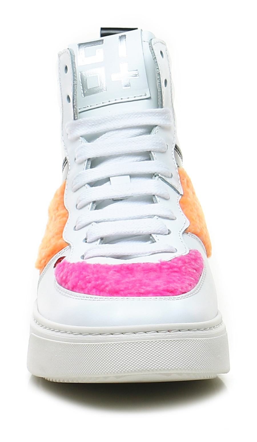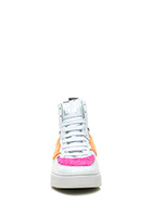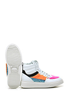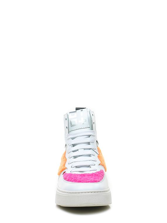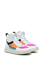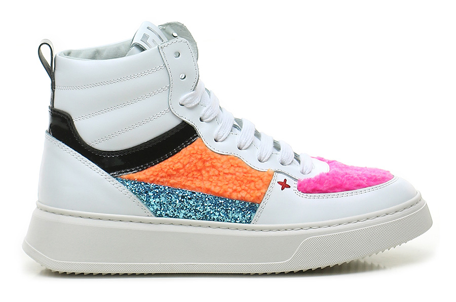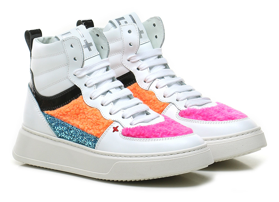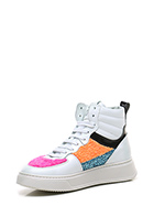 Ledersneaker mit Stoff-, Lack- und Glitzereinsätzen. Gummisohle. 40 mm Absatzhöhe, 30 mm Plateau mit 10 mm Absatz.