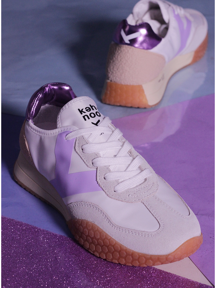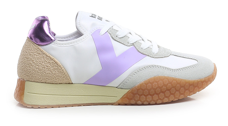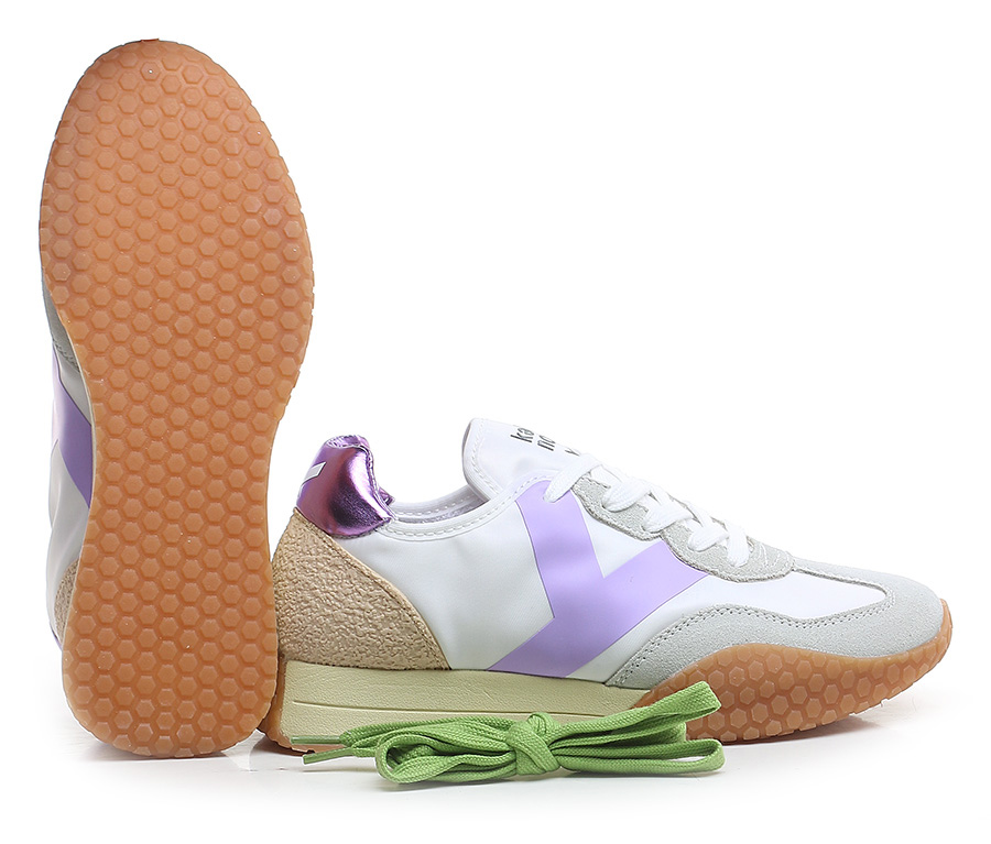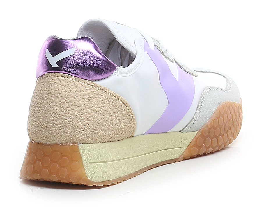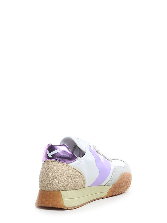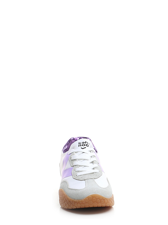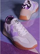 Sneaker aus Stoff und Wildleder mit Fersenlasche aus laminiertem Leder und PVC-Einsatz auf der Rückseite. Gummisohle. Absatzhöhe 30 mm, Plateau 20 mm mit 10 mm Absatz.