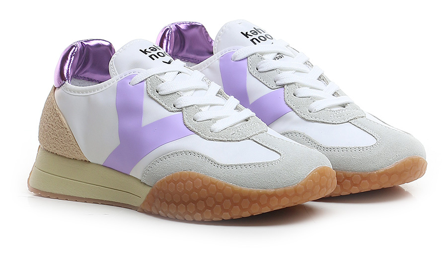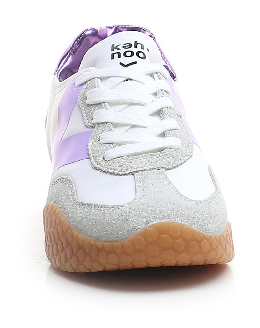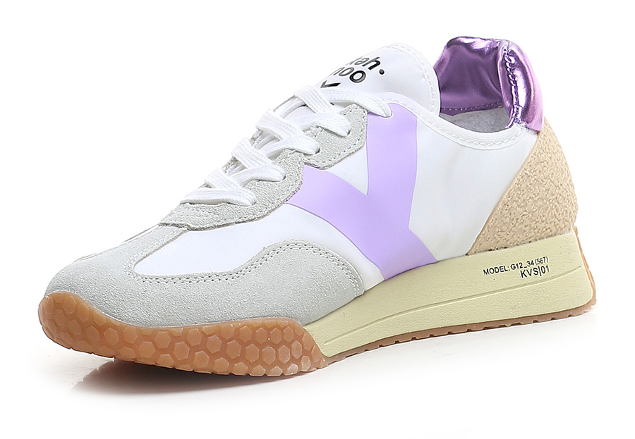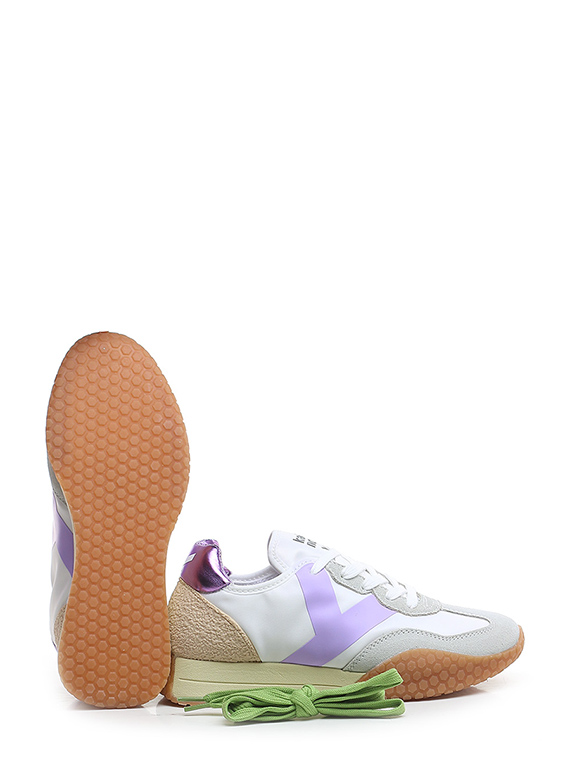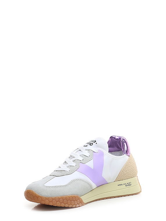 Sneaker aus Stoff und Wildleder mit Fersenlasche aus laminiertem Leder und PVC-Einsatz auf der Rückseite. Gummisohle. Absatzhöhe 30 mm, Plateau 20 mm mit 10 mm Absatz.