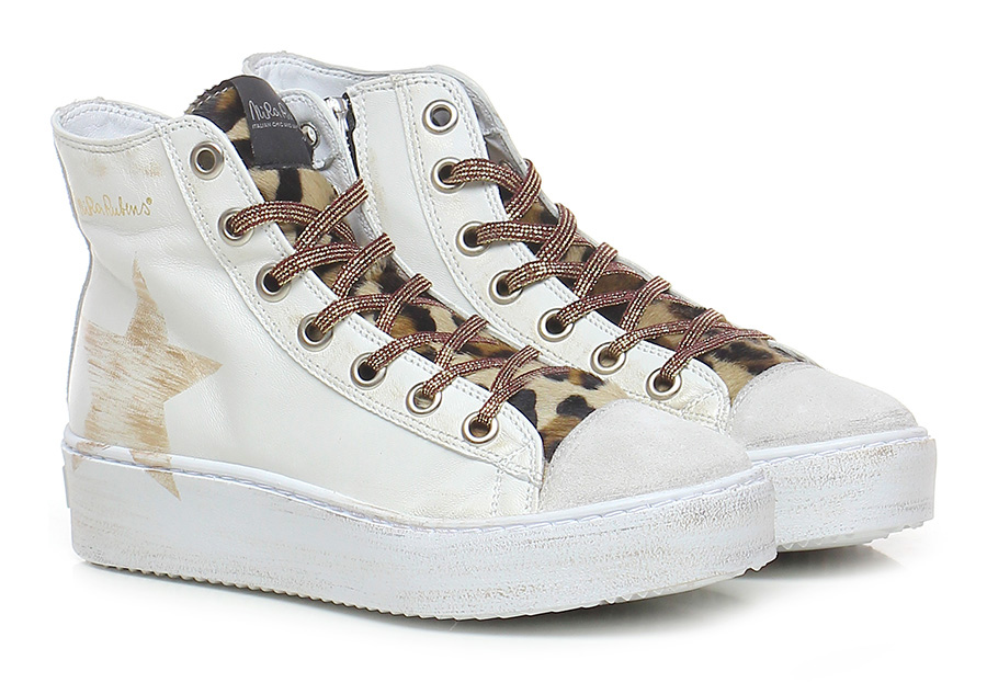 Sneaker in pelle effetto vintage con linguetta in cavallino e puntale in camoscio, zip lato interno .Suola in gomma. Altezza suola: 40, platform 25 con batuta 15.