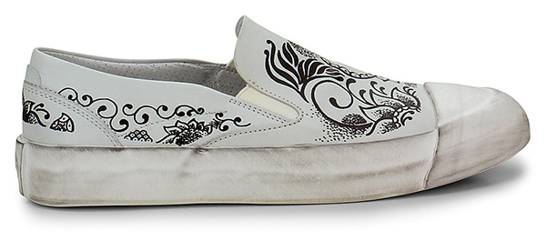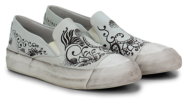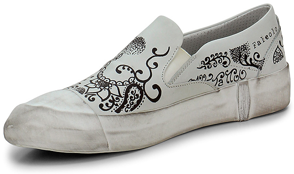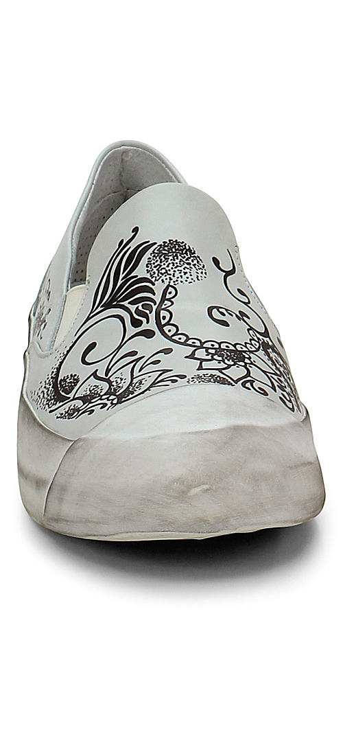 Sneaker aus bedrucktem Leder mit Gummibändern an den Seiten und Gummisohle mit Vintage-Effekt. Logo auf der Ferse, Absatz 30.