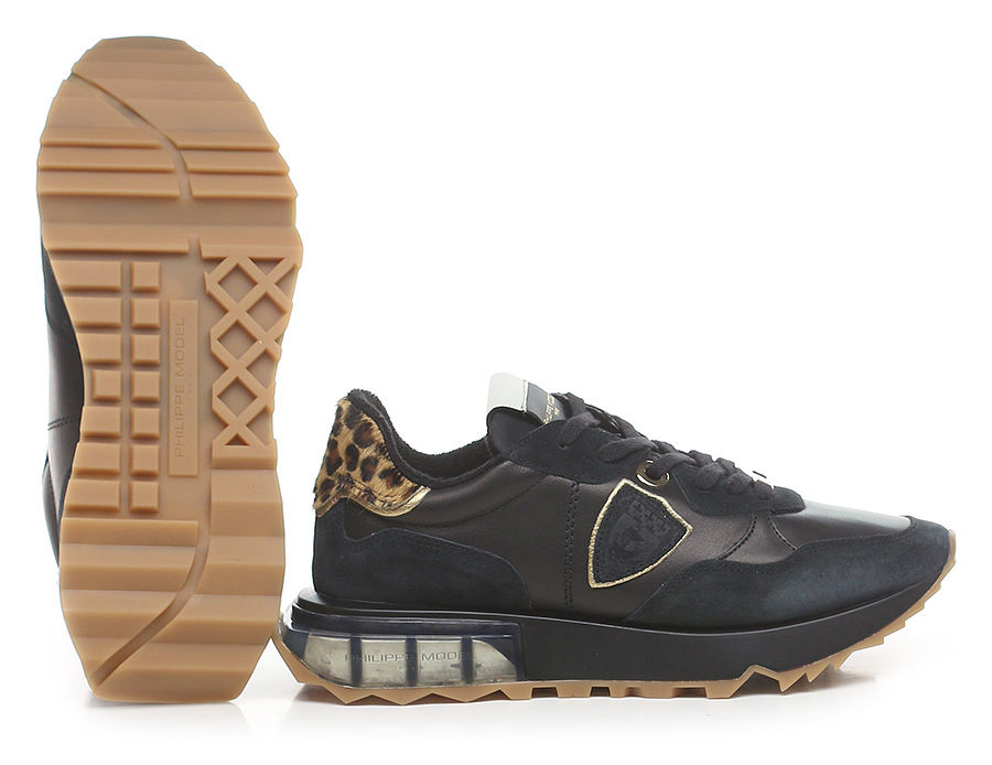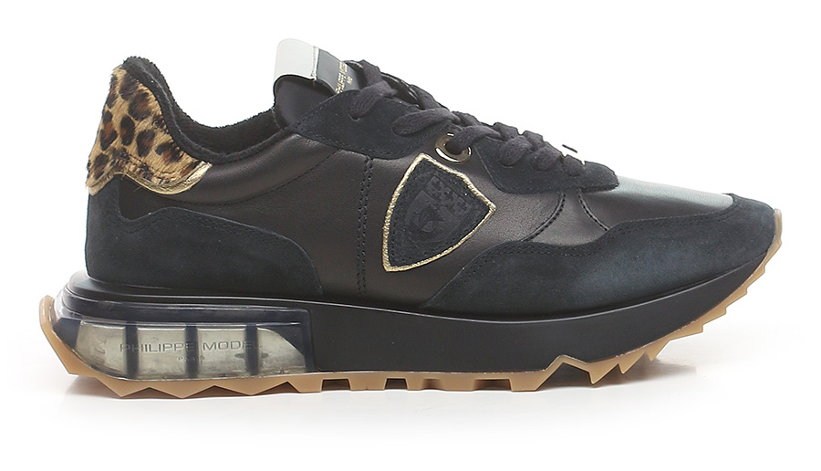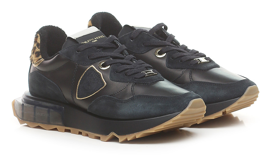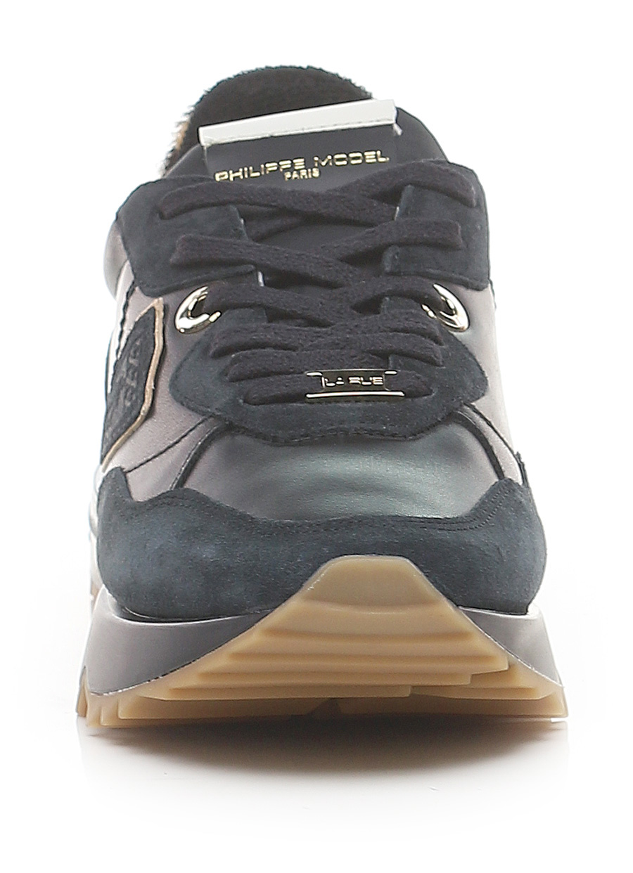 Sneaker aus Leder und Wildleder mit Fersenlasche aus Ponyfell. Gummisohle. 40 mm Absatzhöhe, 30 mm Plateau mit 10 mm Absatz.