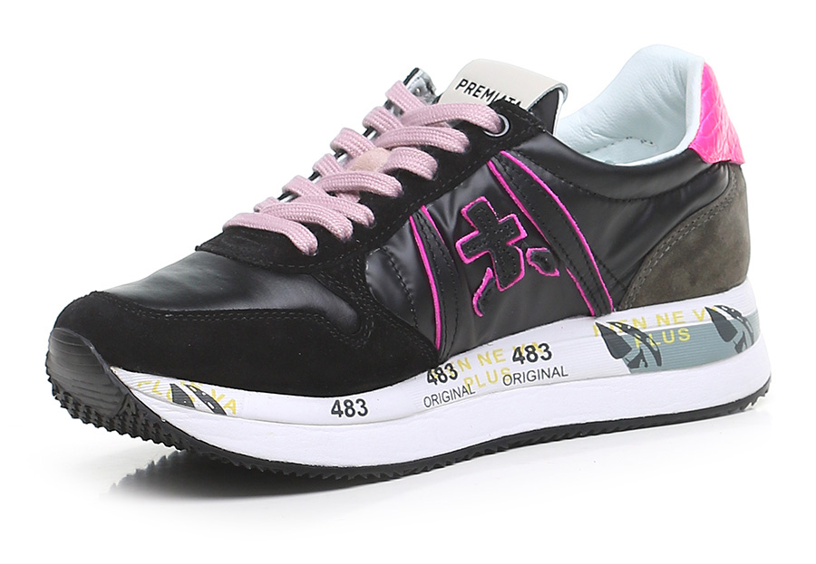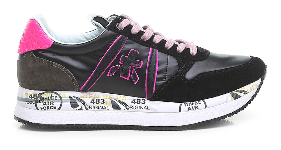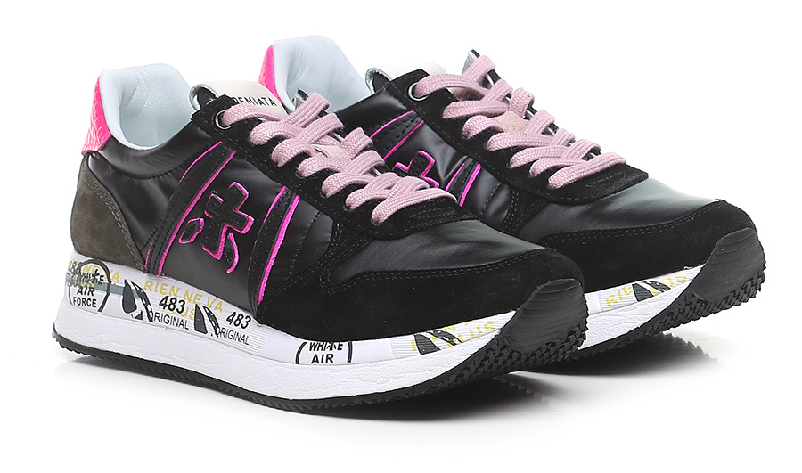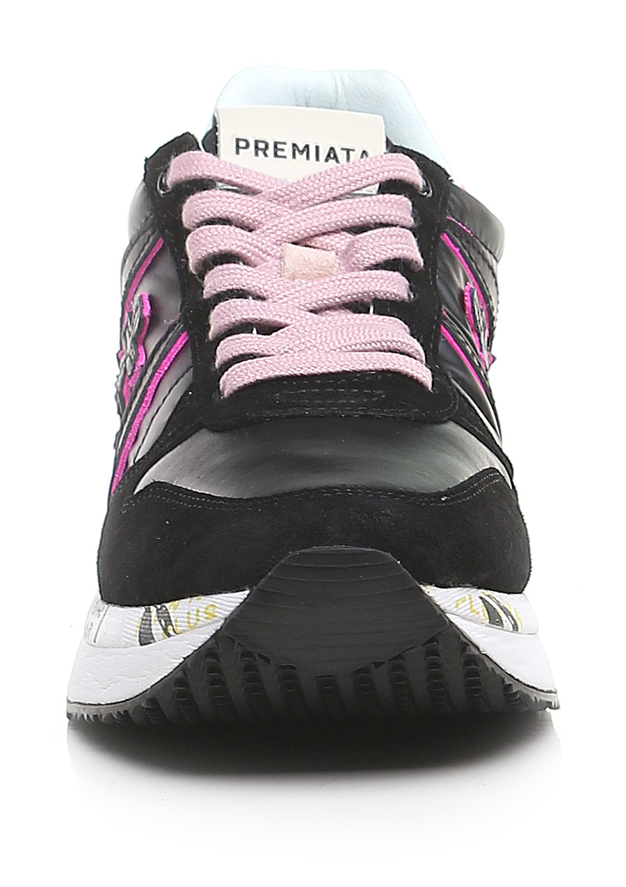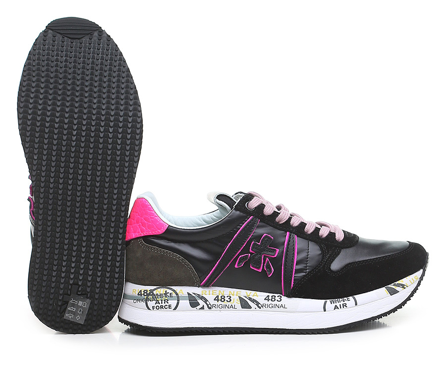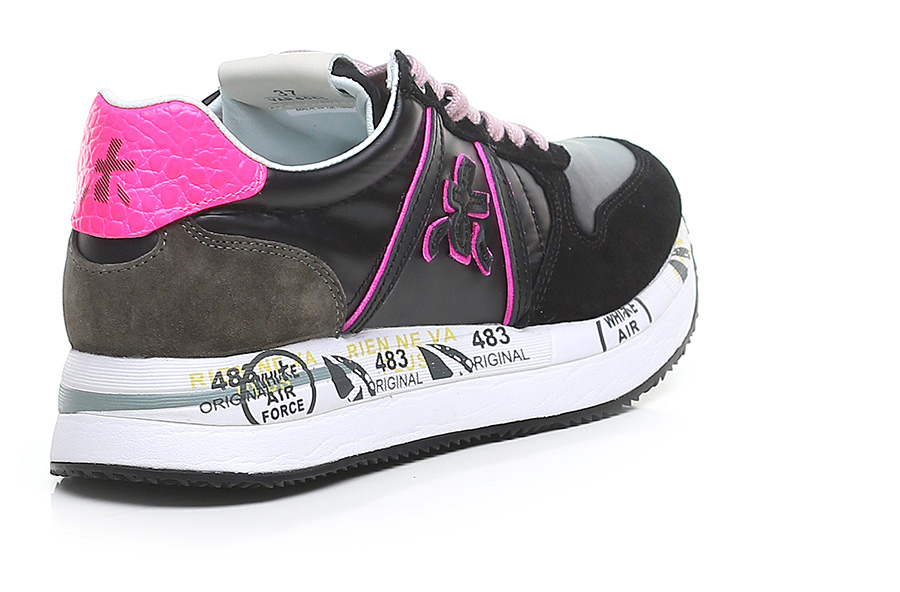 Sneaker aus Stoff und Wildleder mit Ledereinsätzen und Lederabsatz mit Krokoprägung. Gummisohle. Absatzhöhe 40 mm, Plateau 30 mm mit 10 mm Absatz.