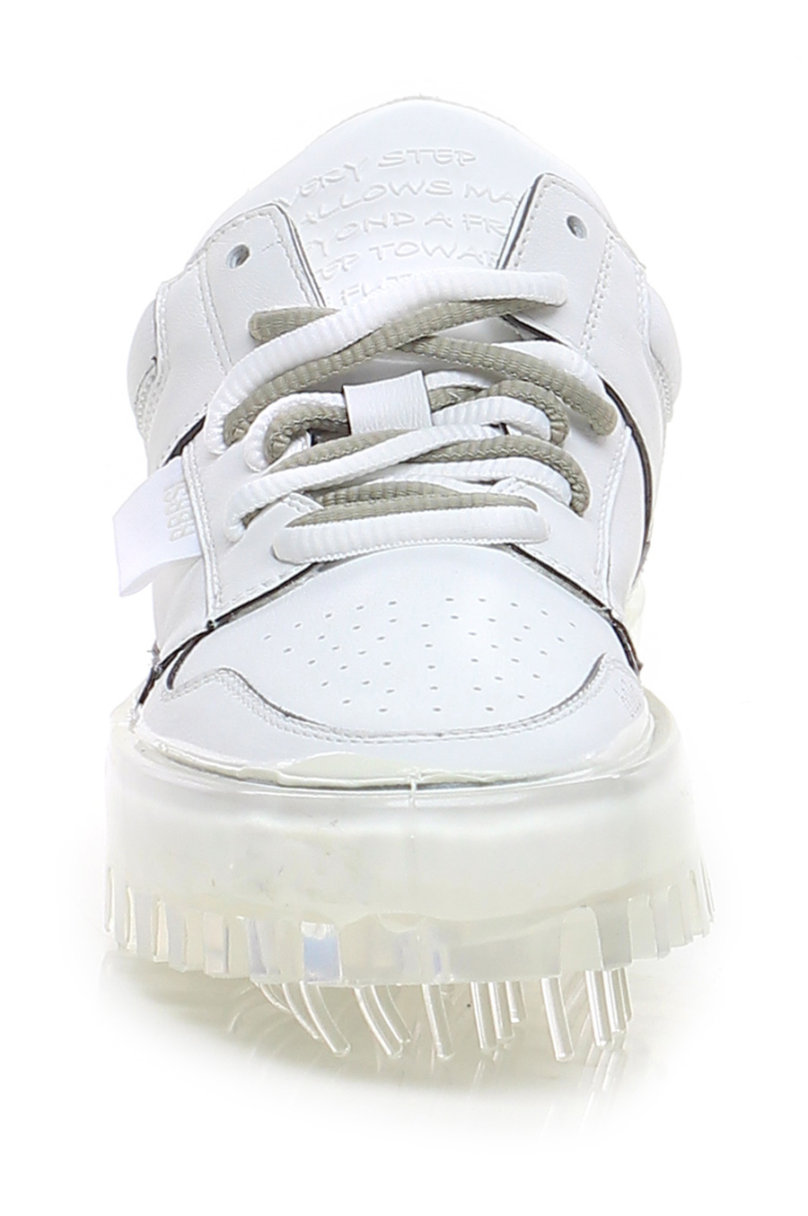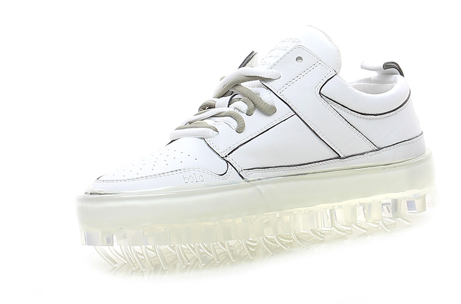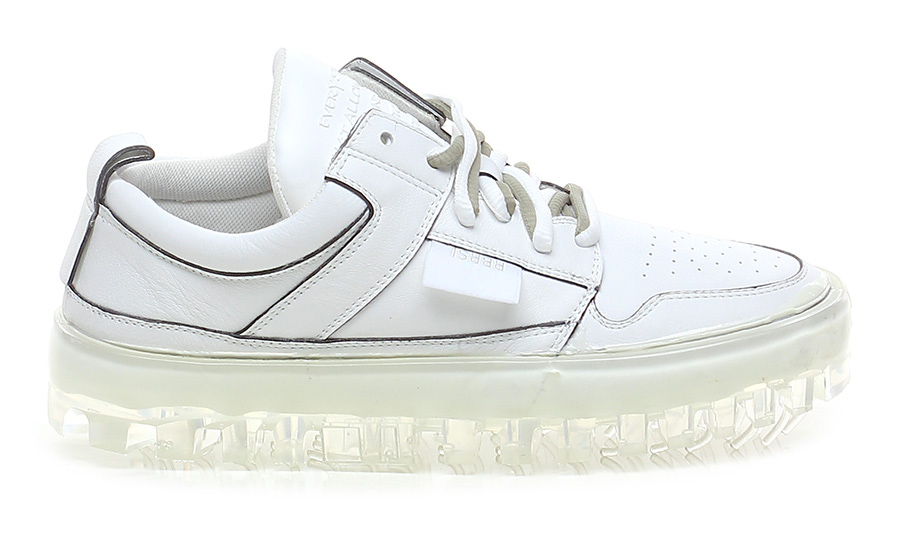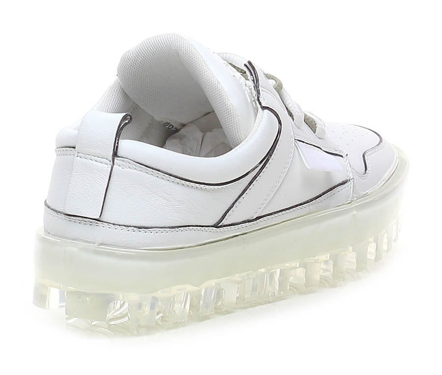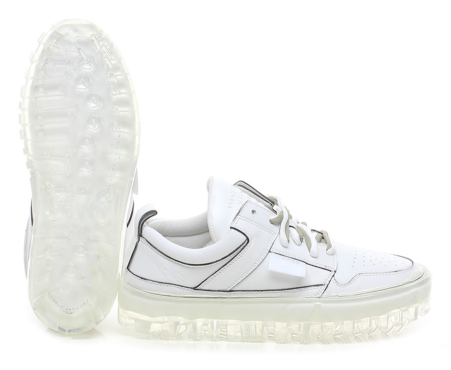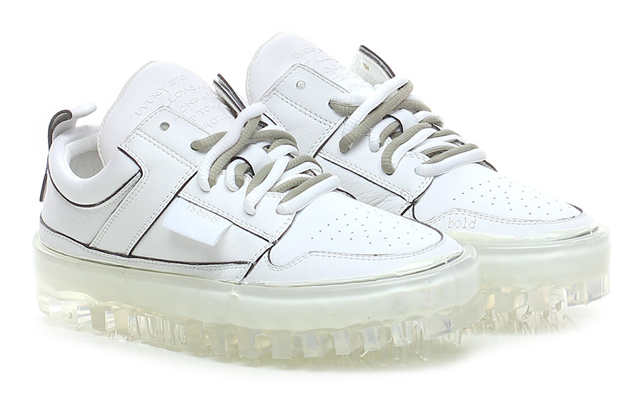 Ledersneaker mit Gummieinsätzen und Zunge mit geprägtem Payoff, Stollensohle aus transparentem flüssigem Material in einer patentierten Form, die bei hoher Temperatur stimuliert wird. Sohlenhöhe: 35, Plattform 30, Plattform 5.