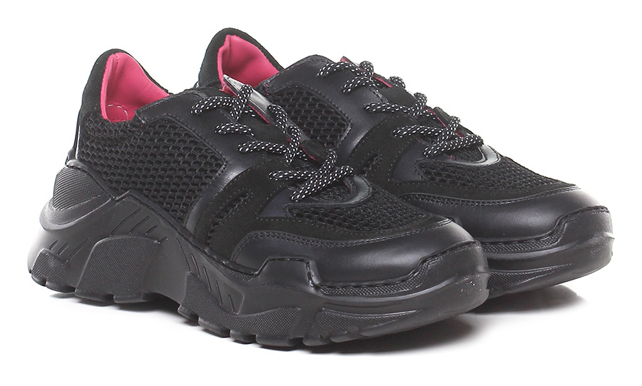 Sneaker in pelle, camoscio e tessuto con suola in gomma extra light. Tacco 65, platform 35 con battuta 30.