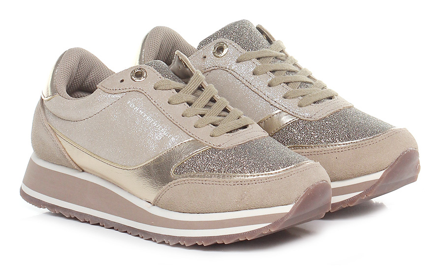 Sneaker in camoscio, eco pelle laminata, glitter e camoscio laminato con suola in gomma. Tacco 35.
