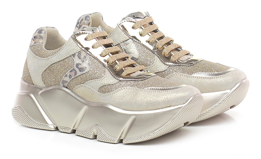 Sneaker in tessuto lurex, camoscio e eco pelle laminata, suola in gomma oversize. Altezza suola: 50, platform 40 con battuta 10.
