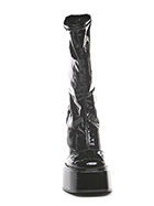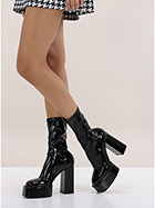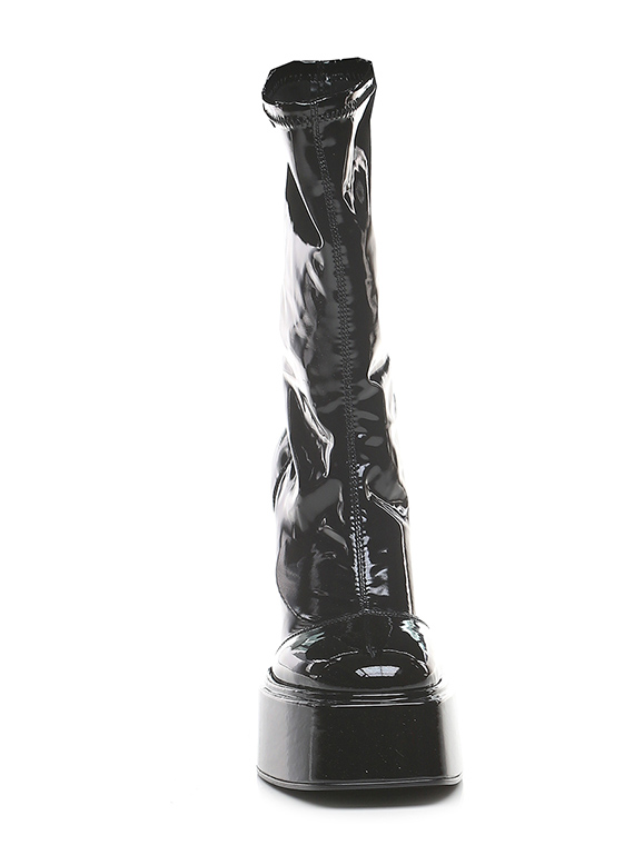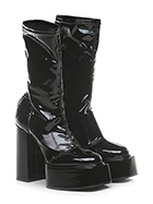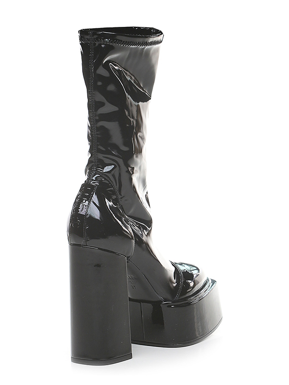 Stiefelette aus Kunstleder und Stretch-Kunstleder mit Lackeffekt. Gummisohle. Absatzhöhe 120 mm, Plateau 50 mm mit 70 mm Absatz.