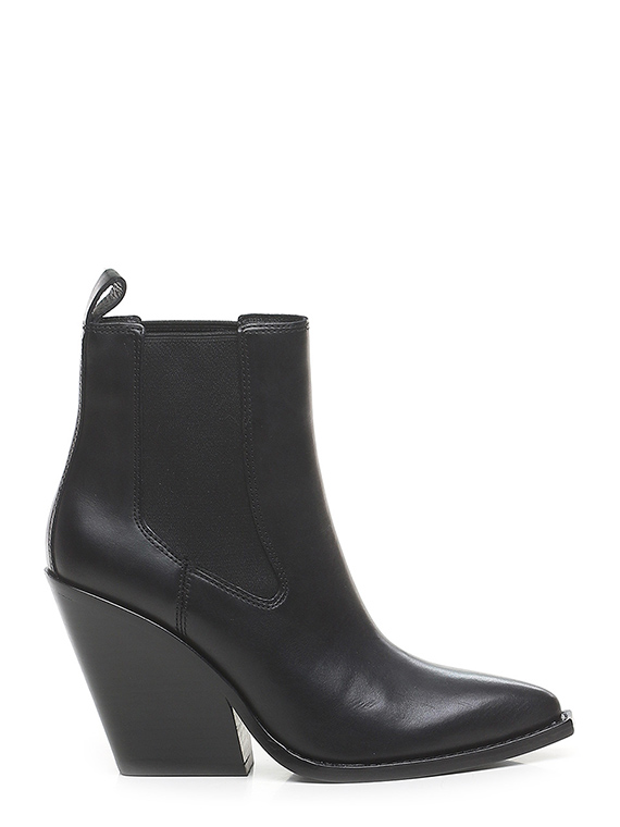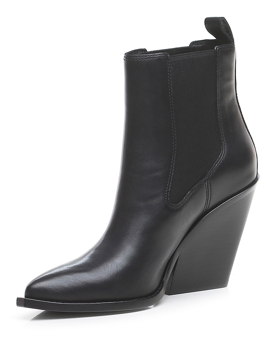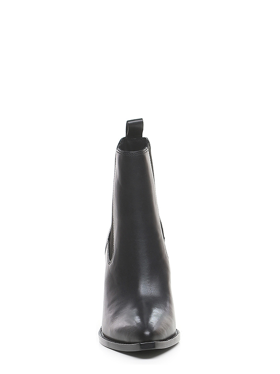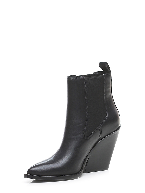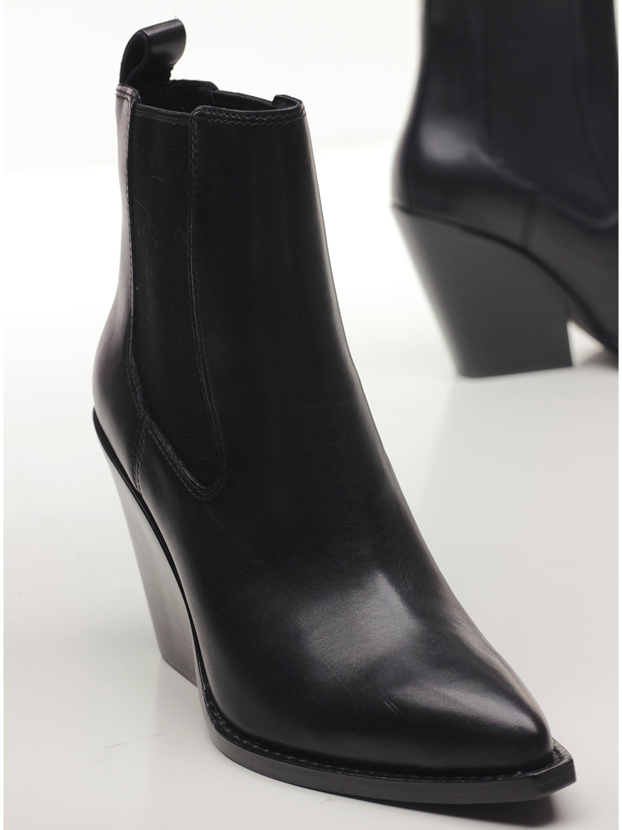 Lederstiefelette mit seitlichen elastischen Einsätzen und Ledersohle. Absatzhöhe 95mm. Absatz in Holzoptik.