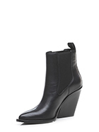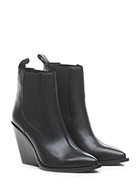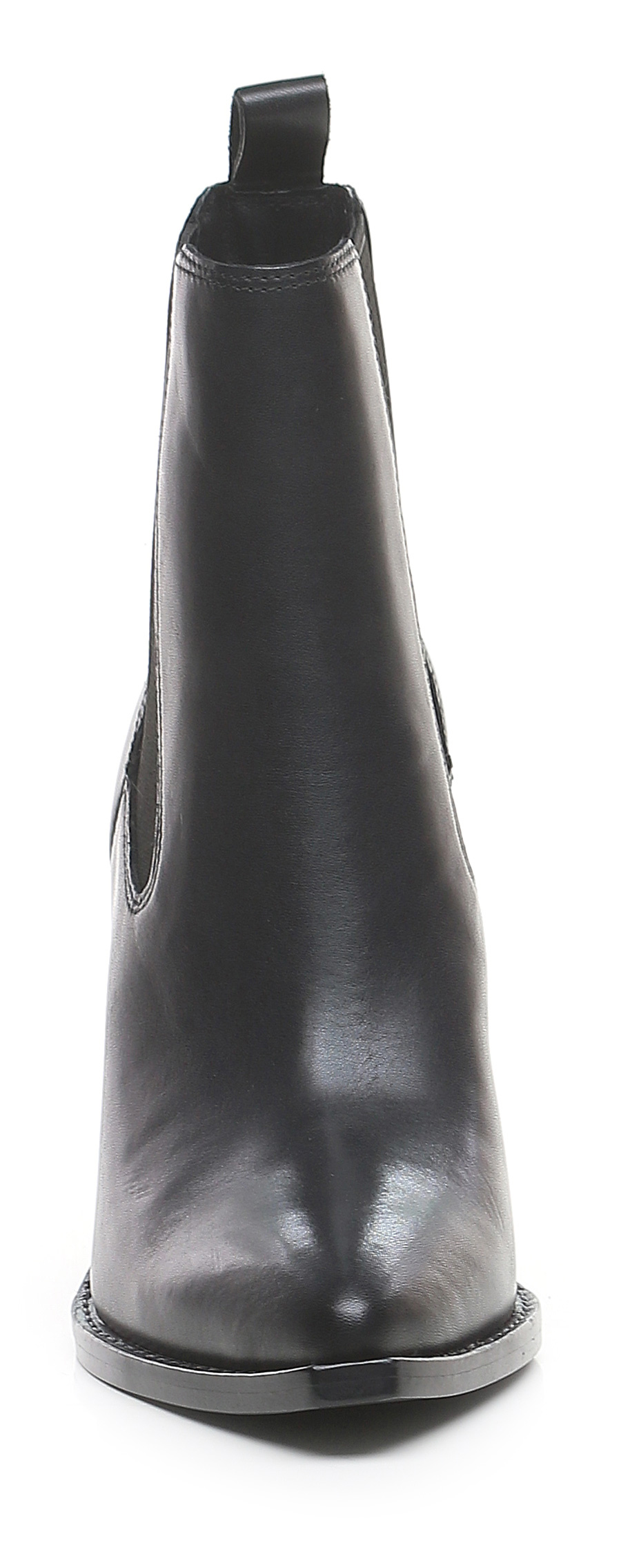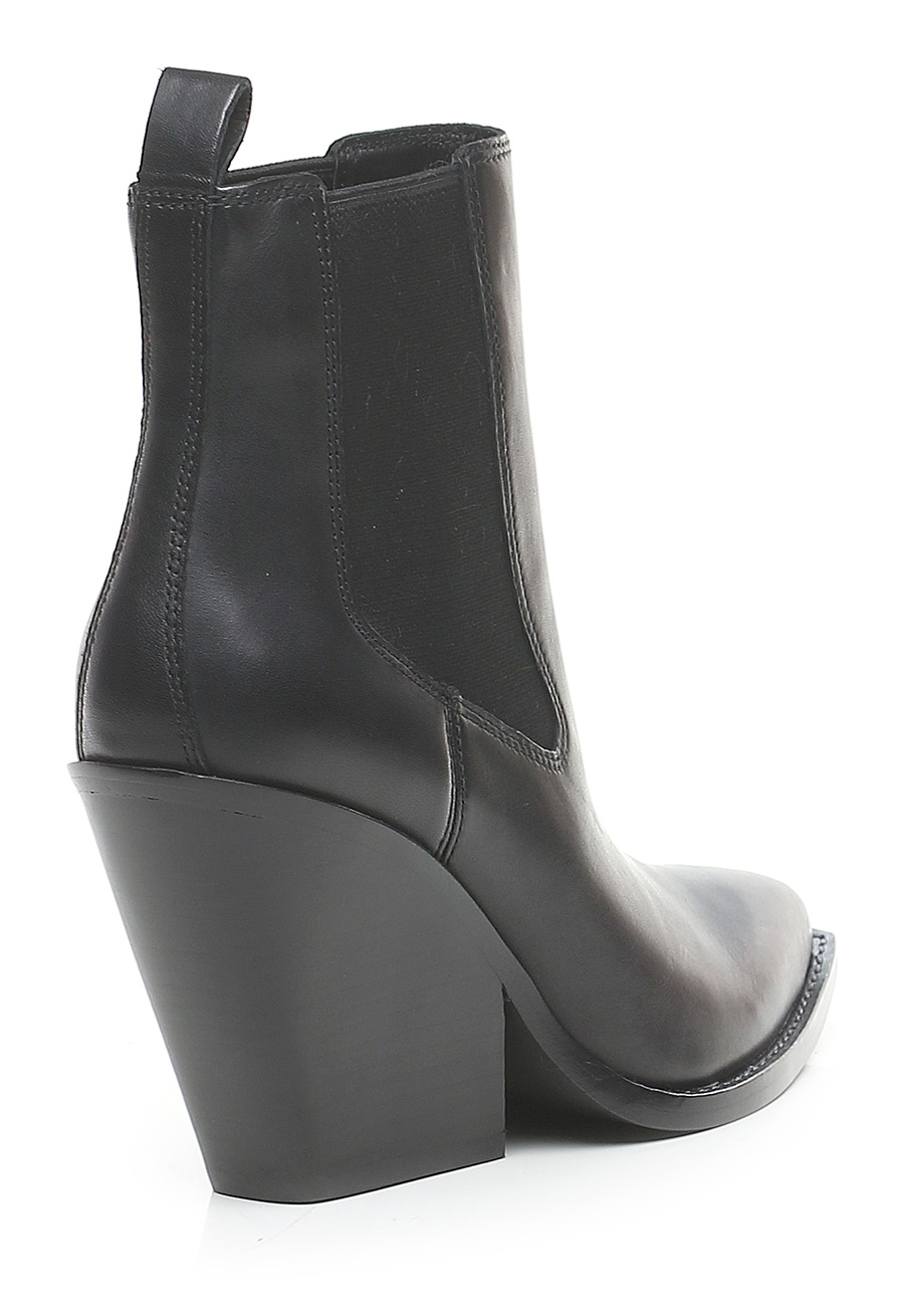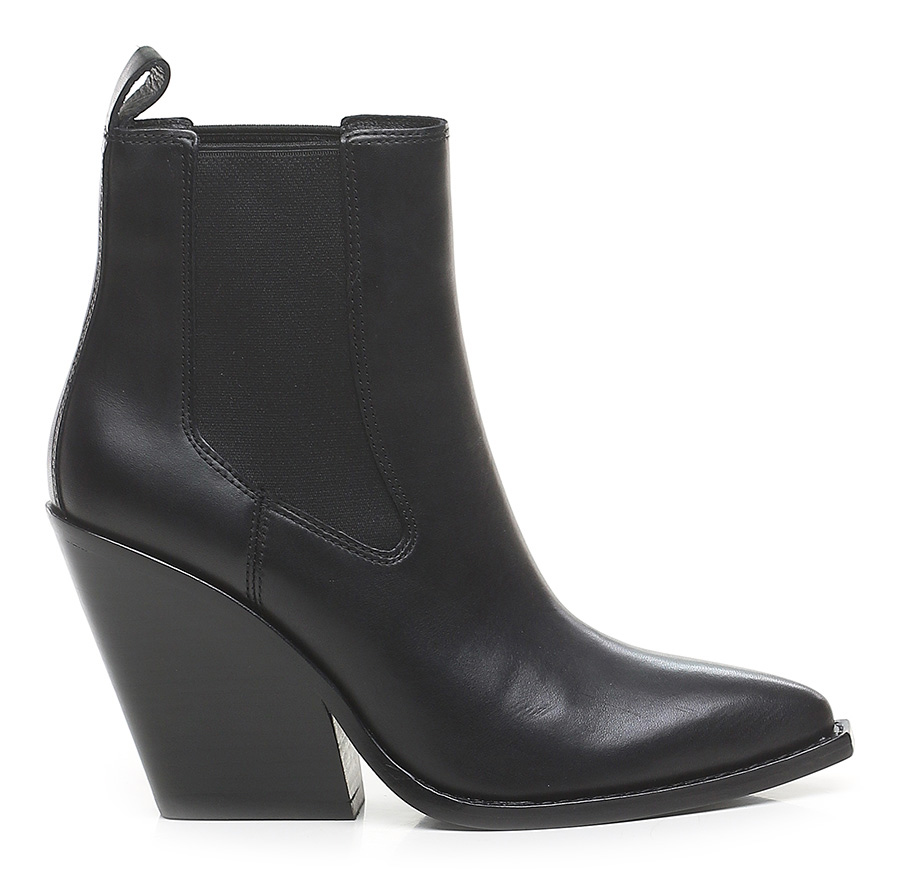 Lederstiefelette mit seitlichen elastischen Einsätzen und Ledersohle. Absatzhöhe 95mm. Absatz in Holzoptik.