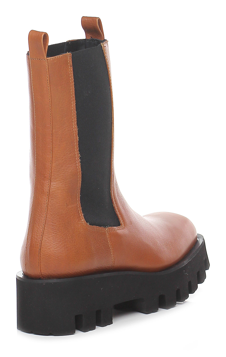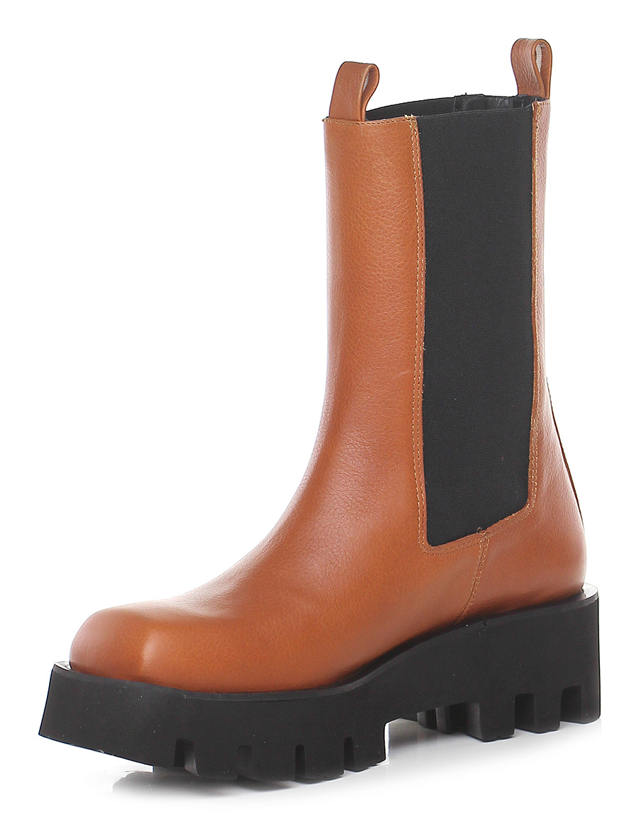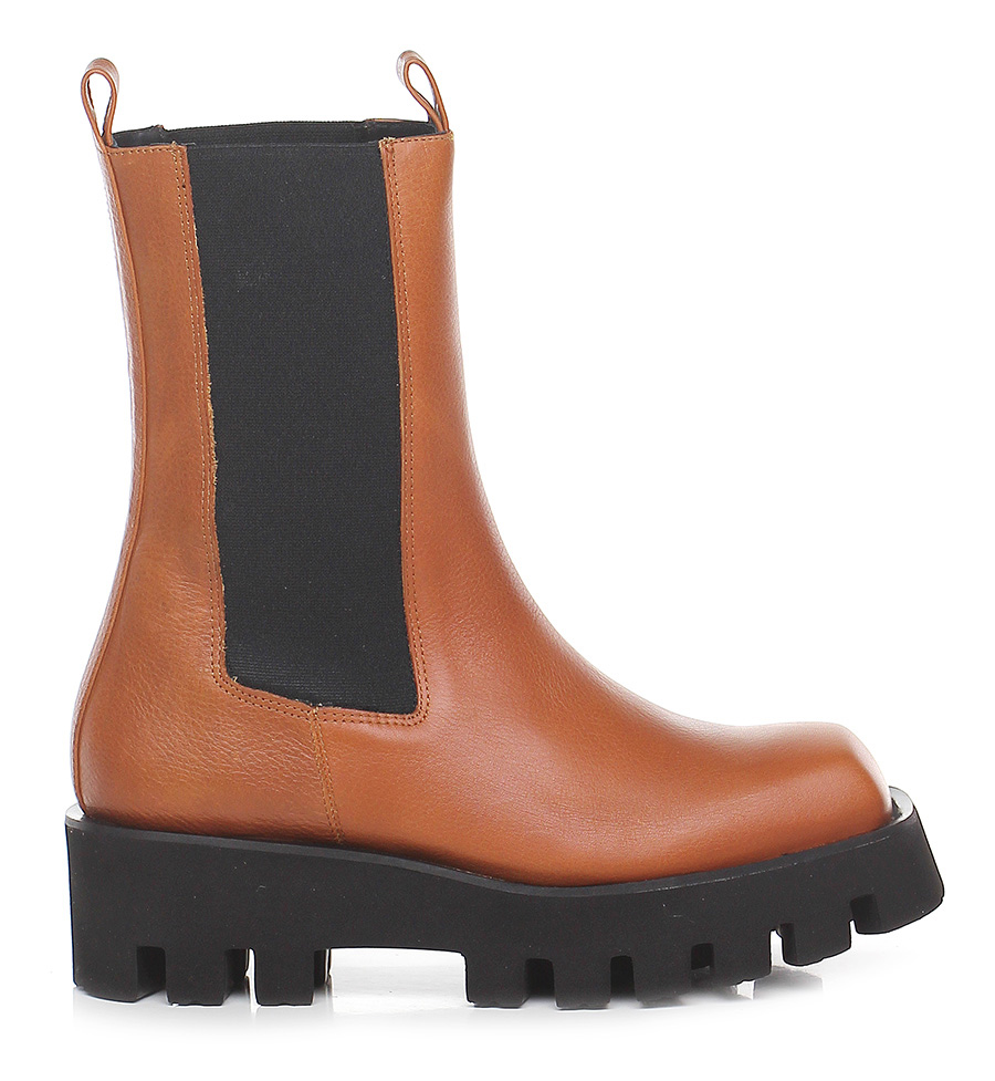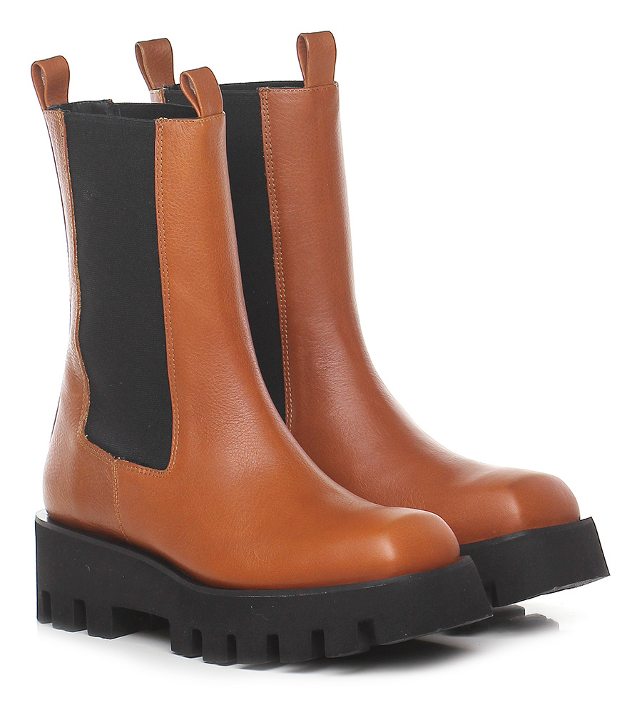 Stiefelette aus Leder mit elastischen Einsätzen im Chelsea-Stil. Stollengummisohle: 50 mm Absatzhöhe, 40 mm Plateau mit 10 mm Absatz.